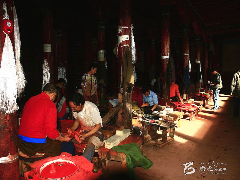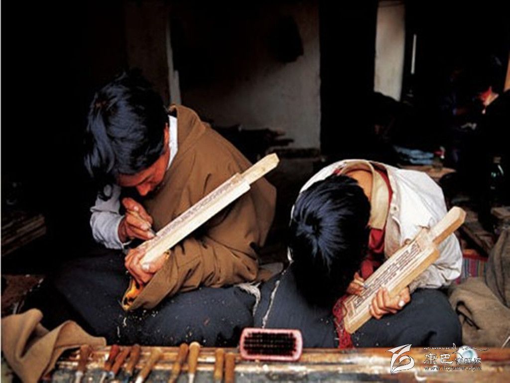 德格印經院的各種傳統產業,當地居民的生產勞動都立足于當地自然環境資源,并且全面地支持著傳統印刷技術系統的各階段。包括“瑞香狼毒”的草根造紙方法,均與德格地區的傳統產業有關。藏紙是當地居民用傳統手工方式制造的印刷紙,是用一種叫“阿交如交”(瑞香狼毒)草本植物根須為原料制造而成。這種紙的顏色微黃,質地較粗厚,但纖維柔軟,不易脆,吸水性強,同時還具有防蟲蛀、防鼠咬,久藏不壞的特點。印經院的印刷用色通常分為紅版和墨版兩種。木刻印版的刻制工作更為艱辛,印經院選聘藏文知識高深淵博的名士將所要刻制的圖書進行嚴格細致的三級審校,才可由聘請的藏文書法技藝精深的學者嚴格按照藏文書法正楷要求開始橫版書寫工作,他們將圖文描繪在半透明的薄紙上反貼在板面上。刻工們依據紙上的色差進行刻制,刻完后編師們在清樣上還要進行三校,版面改動較多的必須進行重刻,一般的進行補刻。直至完全準確無誤時將印版放在酥油里浸泡一天后,取出曬干,再用一種名叫“蘇巴”的植物根熬水洗凈曬干,至此一塊印版的制作才算全部完成,可入庫上架和進行印刷。通常情況下,技藝嫻熟的一名工人每天完成一張書版的單面刻制,畫版刻制工作量更大。雕刻技工都是來自本地及周邊地區的民間藝人。