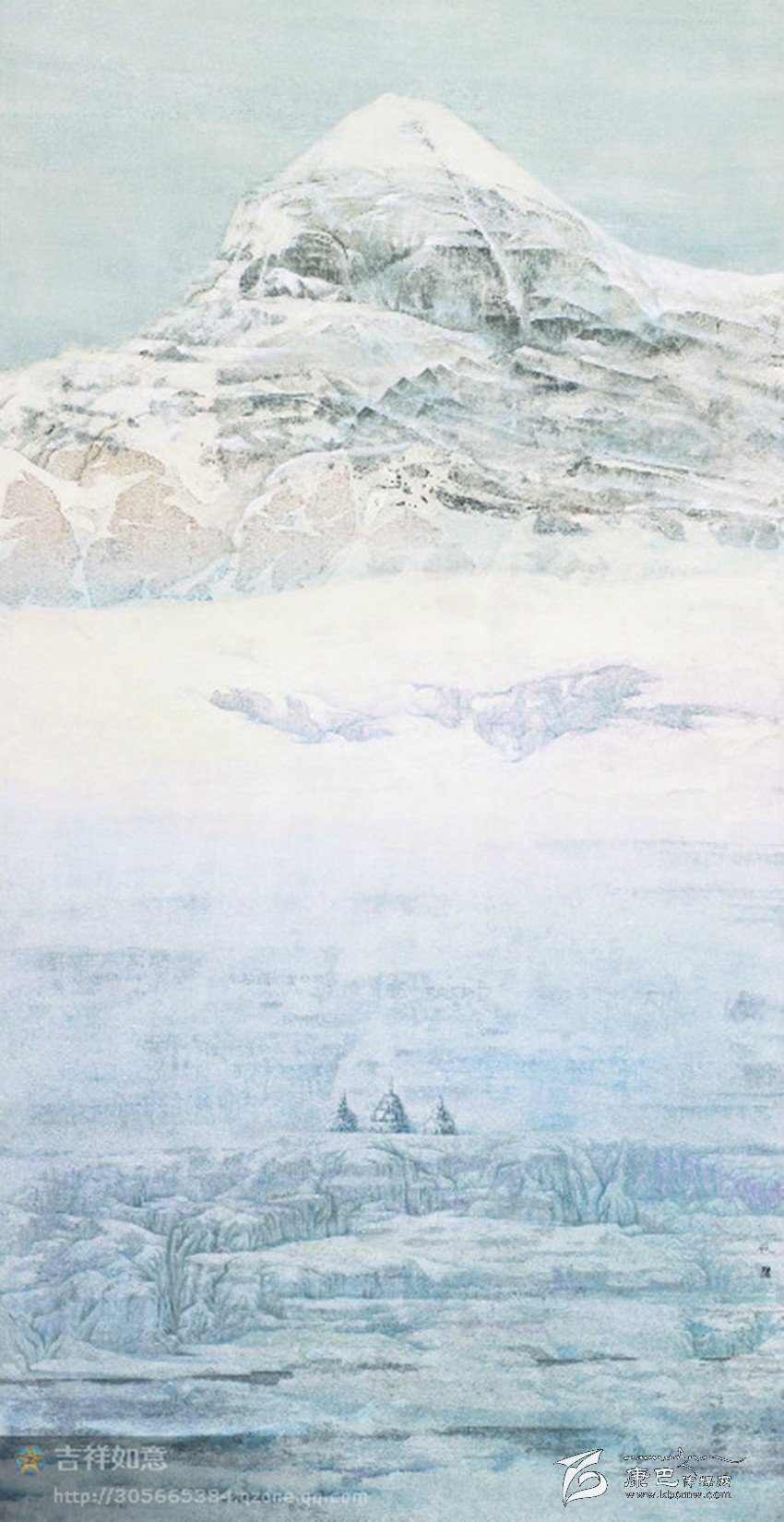 最后創作出了這張作品:神圣的岡仁波齊,您是世界中心;巍巍頂上是幾千年來,帝釋天的居所;山下積雪皚皚,在滿是瑪尼的巖壁下,是象征佛、法、僧的三座石塔,又宛如你忠實的信徒正在對你娓娓述說、虔誠祈禱。時間的河流,正在您腳下寂靜、流逝、封凍。