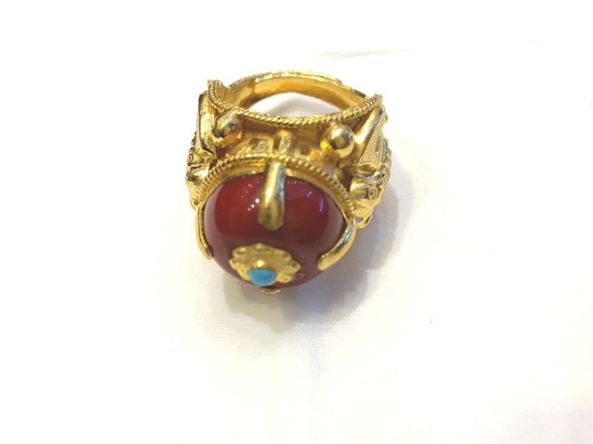 蜜蠟是藏家裝飾中的上成品,藏民族對蜜蠟的喜愛是非常誠懇的,表達著他們對大自然的無限崇敬之情與大自然饋贈的感謝之情。在他們看來,蜜蠟除了能夠作裝飾品佩戴、收藏之外,最引人注目的就是靈性修行之功效,設(shè)計師在此款戒指的設(shè)計上,緊扣藏民對蜜蠟的喜愛,并將漢式花邊與蜜蠟結(jié)合,是對藏漢文化交流較好的體現(xiàn)。