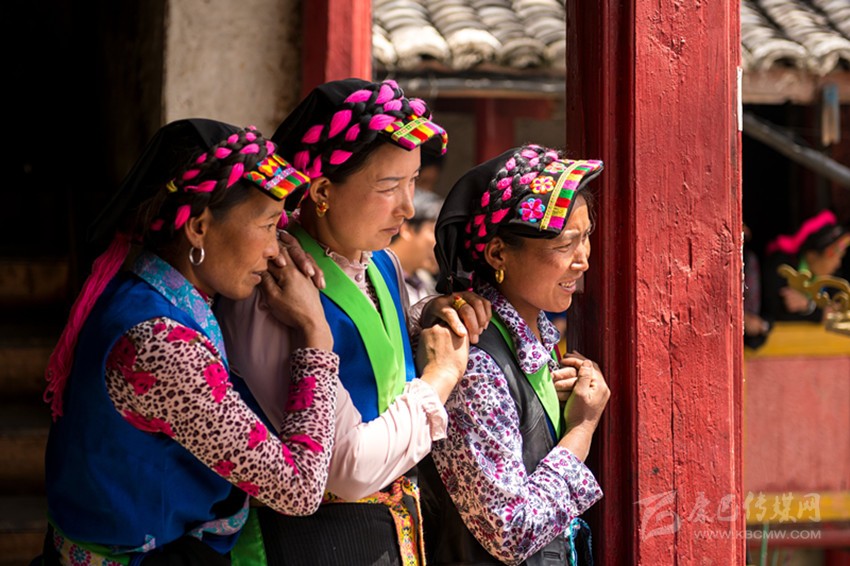 在魚通地區,不少人還保持著古老的裝束,男子穿青色或黑色的長布衫,用布帶束腰,勞作或天冷時會在外加一件用動物皮加工做成的皮褂子,老人以青布包頭,帕長約3丈左右,纏成大盤頭。女子也穿長衫,頭戴方形青色頭帕,腰系圍腰帕。頭帕繡有彩色花邊,發辮用青色、藍色或紅色的絨線盤于頭帕之上。圍腰帕為梯形,上窄下寬,邊緣用藍色或淺綠色布料做裝飾。圍腰帕分為兩種,一種繡著各種精美圖案,一般在重大節日和喜宴上穿戴,一種比較簡潔素凈,一般在日常生活中穿戴。