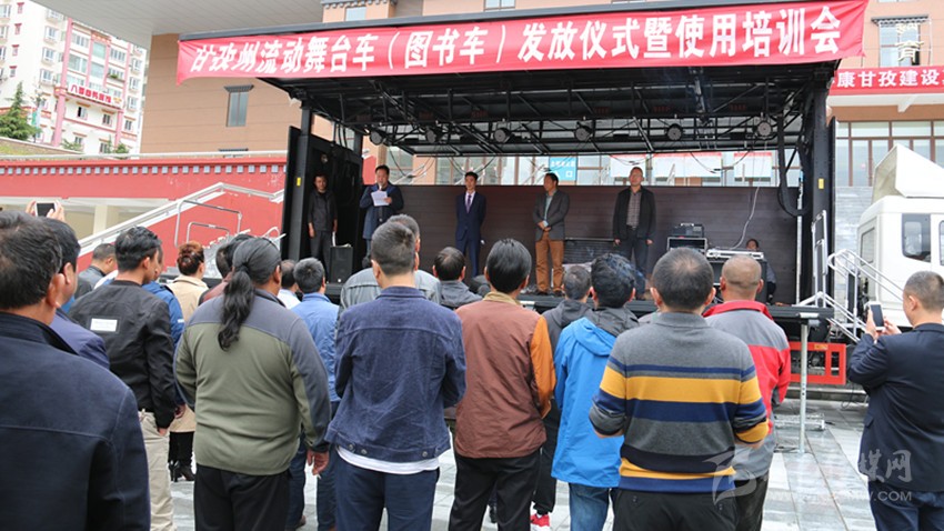 本網訊(記者 宋志勇 文/圖)6月22日,我州流動舞臺車(圖書車)發放儀式暨使用培訓會在康定舉行,旨在為全州13個縣(市)及州歌舞團、州圖書館統一配發流動舞臺車、圖書車,著力解決基層群眾看文藝演出難、看圖書難以及文藝表演團體下鄉演出搭臺難、轉點難等實際困難,進一步豐富基層農牧民群眾文化生活。這是繼全國文化信息資源共享、鄉鎮綜合文化站建設實施的又一文化惠民工程。