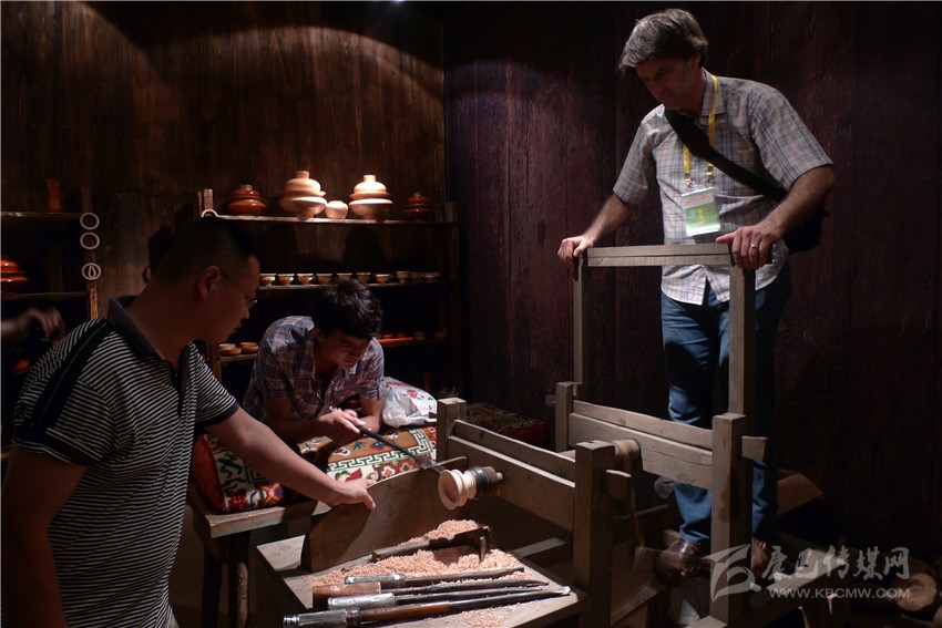 或許是因為父子倆健康的形象,又或許是藏式木制工藝品獨有的自然之美,不少人們都在得榮傳統車模技藝的展點上停留下來,走上傳統的車模機子,感受藏式木制器具的制作過程。