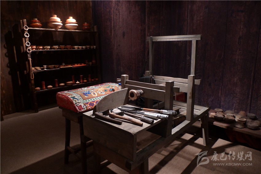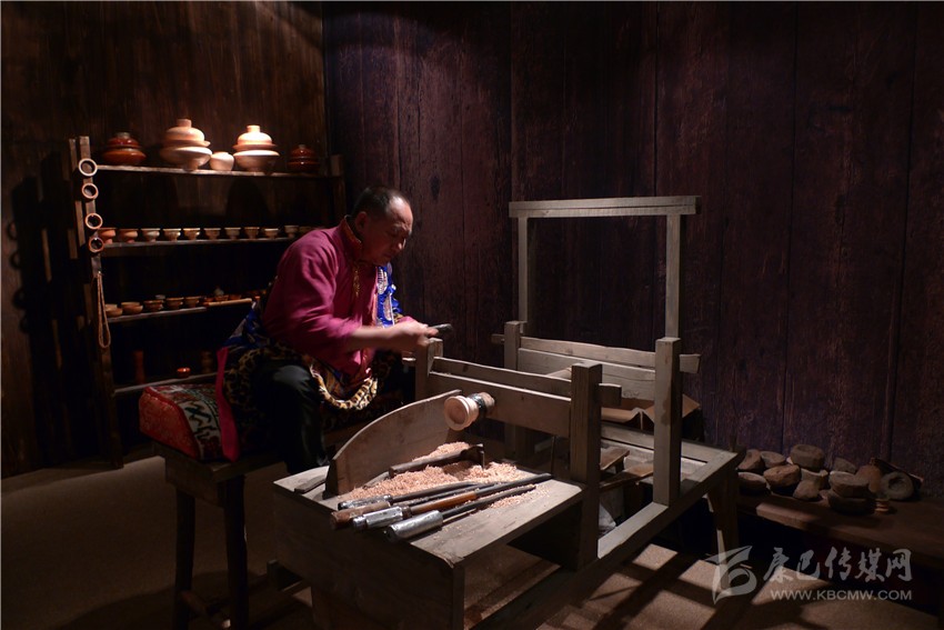 一處古色古香的展柜上,各種藏式木制茶具、碗散發著古老質樸的氣息,天然的花紋自然流暢,色澤婉轉溫厚。距離展柜較近的地方,兩架可手工操作的藏式木制機器有規律地運轉著,來自得榮的格絨次仁父子正在機器上演示藏式木碗的制作過程。
