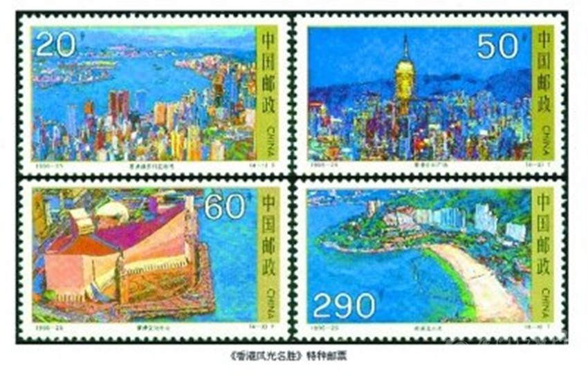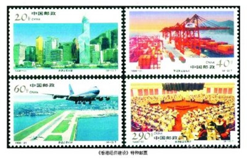 在香港回歸祖國的進程中,為了讓全國和世界人民認識香港,了解香港,我國相繼發行了兩套介紹香港風光名勝和經濟建設的特種郵票。1995年11月28日,我國發行《香港風光名勝》特種郵票,全套4枚。圖案分別為“維多利亞港灣”“中環廣場”“文化中心”和“淺水灣”;1996年12月19日發行《香港經濟建設》特種郵票,全套4枚。圖案分別為“香港中銀大廈”“香港集裝箱碼頭”“香港啟德機場”和“香港聯合交易所”。