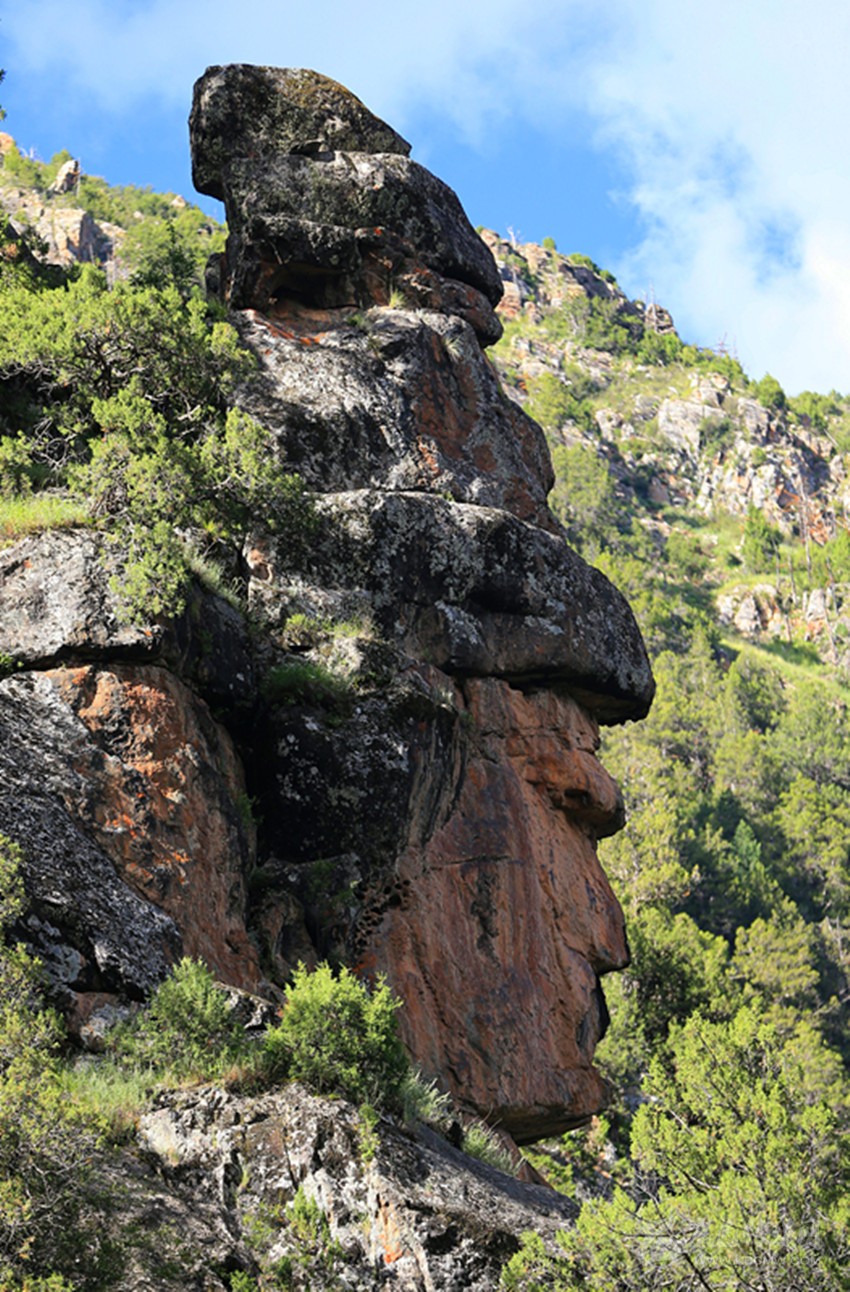 從多爾家溝口走7公里到日貢多時,在右側的山巖上發現了一處自然形成的人頭像。耳、眉、眼、口、鼻五官形象逼真,還穿戴著帽子和盔甲,第一眼看見就不禁聯想到格薩爾藏戲面具和格薩爾石刻中的格薩爾王形象。