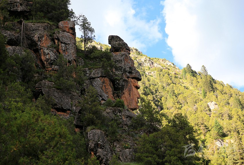 當地人稱其為扎朵菊,又叫阿尼嘿塞神山。從河谷右側向上約2000米左右的半山腰就是格薩爾王自生石像所在地,此處山形奇特,整個山體大部分由巖石構成,懸崖峭壁,人根本無法攀越,記者在現場認真反復觀察石像未有任何人工痕跡,完全是自然天成。石像坐西向東,整體由巖石構成,約50米高,周圍灌木叢生。在距格薩爾王自生像不遠的最高處,還發現了一處珠牡王妃坐式巨型山巖。在陽光的照射下,逆光的剪影效果令她的發髻、臉部和體形都呈現得惟妙惟肖。神態極像昂首靜坐的尊貴王妃,目視著格薩爾王。大自然的鬼斧神工在一個山體上造就了格薩爾王和珠牡王妃兩個自生石像,這樣的奇跡也許是冥冥中注定的一種巧遇,真實的出現在多爾家溝,并被鏡頭捕捉下來呈現給世人。