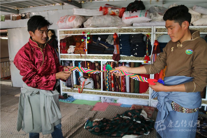 安孜鄉作為白玉縣海拔較高的鄉鎮之一,夏天是十分短暫的,連日來的晴好天氣,也透著絲絲寒氣。牧民阿剛想要量身定做一套過冬的藏裝,9月13日,他來到白玉縣阿察鎮,一家民族服飾商貿公司吸引了他的目光。“我們這里的服裝面料是本地羊毛和從浙江進的上等面料,做工考究,很多工序是純手工制作,服裝樣式你可以根據你的喜好指定,我們包你滿意。”店員仁真熱情地介紹。聽了仁真的介紹,阿剛用手捻了一下服裝用料的質地,看到印有“祥陽措”商標的精美包裝袋,商店里擺放的五彩斑斕、高端大氣的藏式男女服裝,他有些動心了。“生產這些服裝的都是我們納塔鄉的牧民,你可以考察我們的服裝用料、生產流程,再作打算。”仁真熱情洋溢地介紹說。