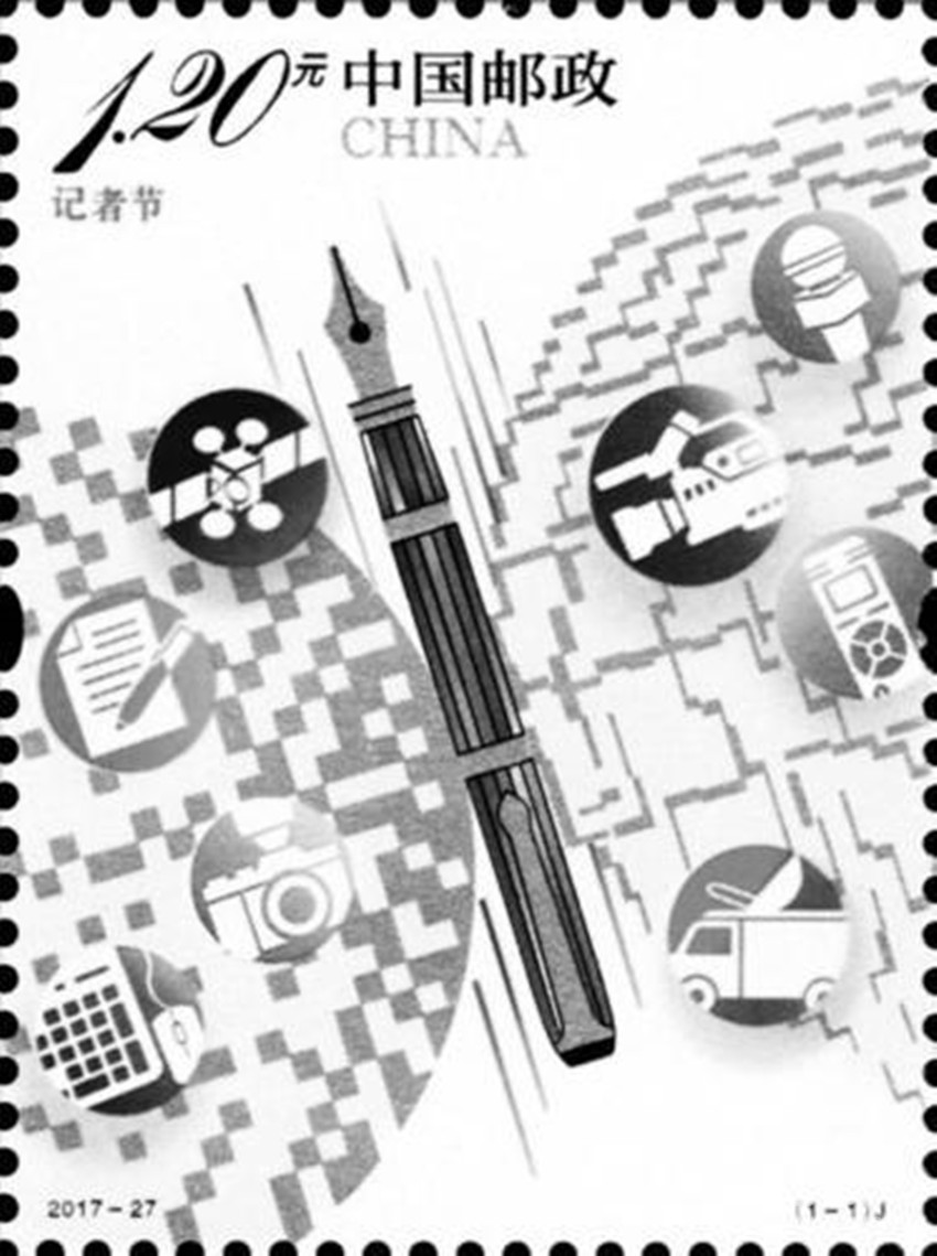 為紀念第18個記者節。中國郵政定于2017年11月8日發行《記者節》紀念郵票一套1枚。郵票圖案采用了具有現代感的構成手法及色彩表達方式。畫面中的鋼筆象征了記者秉持弘揚民族精神、維護國家利益和社會責任的專業精神和自信風范。兩側的線條及方點構成的兩個圓形圖案分別隱喻地球和現代網絡體系,表示在新媒體時代,新聞傳播媒介所呈現出的多元化、全球化的發展態勢。畫面中麥克風、攝像機、錄音筆等形式各異的采編設備圖標,結合衛星及地面發射站等元素,突出了當代記者巨大的社會影響力。同時,鋼筆和兩側的圓形圖案共同組成了一只振翅飛翔的蝴蝶形象,喻意了記者追求至善至美,在探訪報道中擔負著傳播先進文化,引領和維護和諧社會,推動人類文明的崇高使命和社會責任。