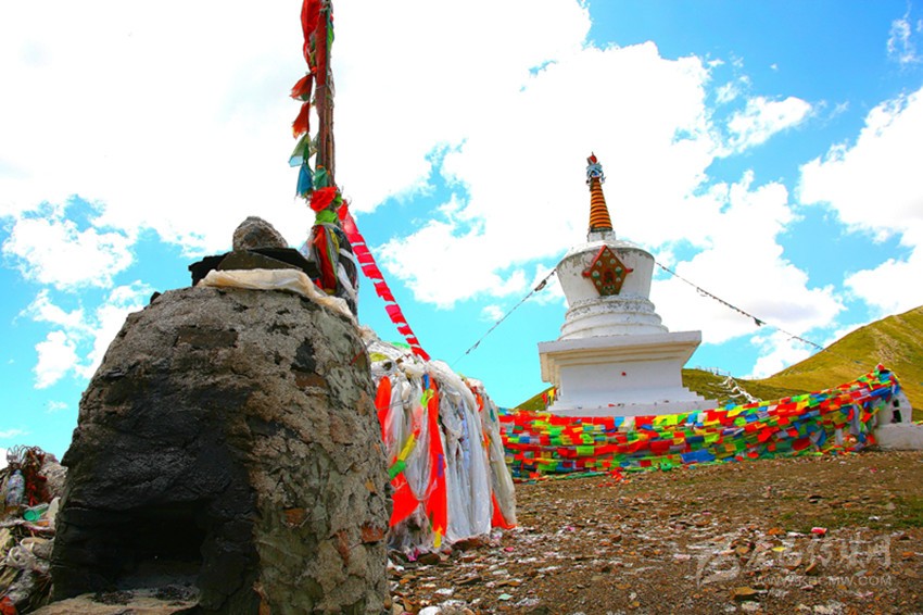 藏族幾乎全民信仰藏傳佛教。折多山上下四周,山頂河谷到處飄揚著五色經幡,或者印以文字,或者繪以圖案。經幡五色,依次是藍、白、紅、綠、黃,藍色象征藍天,白色象征白云,紅色象征火焰,綠色象征綠水,黃色象征大地。五種顏色代表生命賴以存在的基礎。世代生活在高原上的人們對大自然的變化尤其敏感,故企盼大自然風調雨順,人間太平幸福。佛教慰藉了他們的靈魂,經幡寄托了他們的希望。