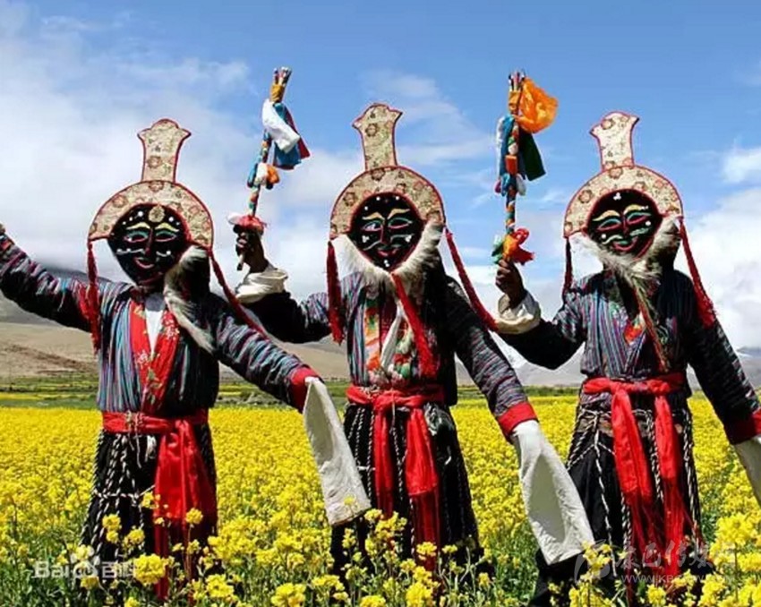 第三部分,被稱為“扎西學(xué)”。頭戴白羊皮面具,面部呈黃色的演員們是吉祥老人的化身。他們雖然老態(tài)龍鐘,但動(dòng)作卻輕盈無(wú)比。其裝束除了腰間纏繞的“子體”未掛五色彩綢外,與“溫巴”別無(wú)二致。他們?cè)跉g樂(lè)的舞動(dòng),向眾人賜福吉祥。