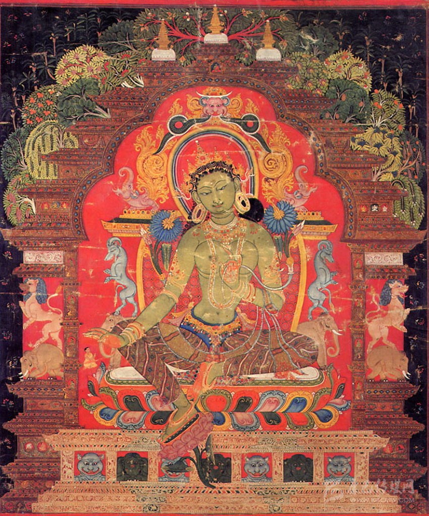 藝術審美是需要互補的,當勉唐派發(fā)展出進取創(chuàng)新的嘎孜派以后,必然出現一種保守風格與之相制衡。公元十七世紀的著名藏巴·曲英嘉措,他在繼承勉唐畫派的基礎上、再次吸收漢地繪畫的一些特色,開創(chuàng)了“新勉唐畫派”也稱“勉薩畫派”。新勉唐畫派受到漢地繪畫的影響,但是必須得同嘎瑪嘎孜畫派拉開距離,尋找出一個新的風格。如果說早期唐卡注重宗教的神圣感,那么后來則是漸漸往世俗傾斜。所以新勉唐畫派就在畫面的裝飾性上下功夫,用花花草草來填充畫面,用金來做各種裝飾紋樣,創(chuàng)造出一種偏向滿足世俗審美的繪畫新風。