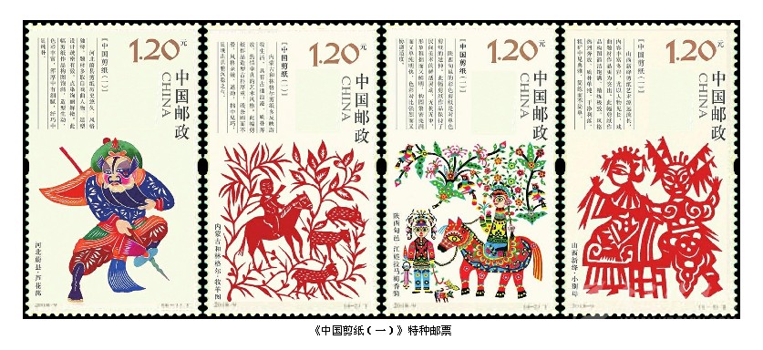 2018年1月24日,中國郵政發行《中國剪紙(第一組)》特種郵票,全套4枚。這是中國郵政繼1959年1月1日發行的《剪紙》特種郵票59年后重新發行的《中國剪紙》系列郵票。全系列郵票計劃發行4組,每組4枚。這次發行的第一組4枚郵票入選內容分別是被列入第一批國家級非物質文化遺產名錄的北方四處剪紙傳承人的作品:第一枚“河北蔚縣·蘆花蕩”,河北蔚縣剪紙歷史悠久,風格獨特,題材多取自于人物,造型設計疏密有致,點染絢麗鮮艷。此幅作品作者王老賞(1890-1951),河北省蔚縣南張莊村人;第二枚“內蒙和林格爾·牧羊圖”,內蒙古和林格爾剪紙多反映游牧生活,具有古拙浪漫、質樸奔放、熱情率真的藝術風格。此幅作品作者張花女 (1903-2004),和林格爾縣董家營鄉曹老八夭村人;第三枚“陜西旬邑·江娃拉馬梅香騎”,陜西旬邑的彩色剪紙具有民間美術的鮮活靈動,無拘無束,形象稚拙而又鮮明,構圖緊密完滿而又單純明快,色彩對比強烈而又協調適度。此幅作品作者庫淑蘭(1920-2004),陜西咸陽市旬邑縣張洪鎮赤道鄉富村人;第四枚“山西新絳·小別母”,山西新絳剪紙藝術源遠流長,內容豐富多彩,尤以人物見長,戲曲題材作品更為突出,構圖簡潔飽滿、精煉極致,粗獷中見典雅,簡煉而不簡單。此幅作品作者蘇蘭花(1906-1995),山西運城市新絳縣澤掌鎮北蘇村人。