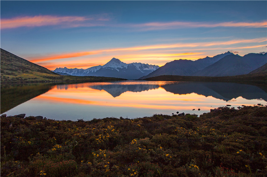 八月的康定本就二十多度,到山上溫度更低一些,加上這里的溪水不比別處的溪流,是雪山融化的水,因此,格外的冰涼。終于到了五色海的邊兒上,整個海子在眼前呈現。此時的五色海對于我們來說,可能不單單是個高山湖泊而已了,在我們抵達五色海之際太陽露出了笑臉,一切都是剛剛好。中午十分撤離五色海回到小木屋,吃過午飯開始下山。