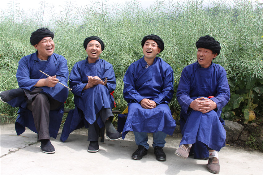 還未走進農家小院便聽見院落里傳來笑聲,笑聲爽朗且渾厚。走進院落,“葉子煙”(當地人自制的一種土煙)的香味彌漫在空氣中,四位頭裹黑布裝飾、身著藍色長袍的阿哥坐在槐樹下談笑風生。得知記者的來意,為首的阿哥將煙桿在鞋底敲了敲,熄滅煙火,便徑直走向堂屋里去了。不搭腔、不搭調的離開,這讓記者感到措手不及,正要喚他出來,他卻手捧自家屋里種的水果,熱情地和記者打起了招呼:“我們四個就是村里唱‘十二杯子酒’酒歌的人,就是圖個熱鬧,要聽‘十二杯子酒’,就得喝我們這里的土酒,今天沒有準備美酒,以水果帶酒招待遠方來的貴客,吃完水果咱們再來擺談。”