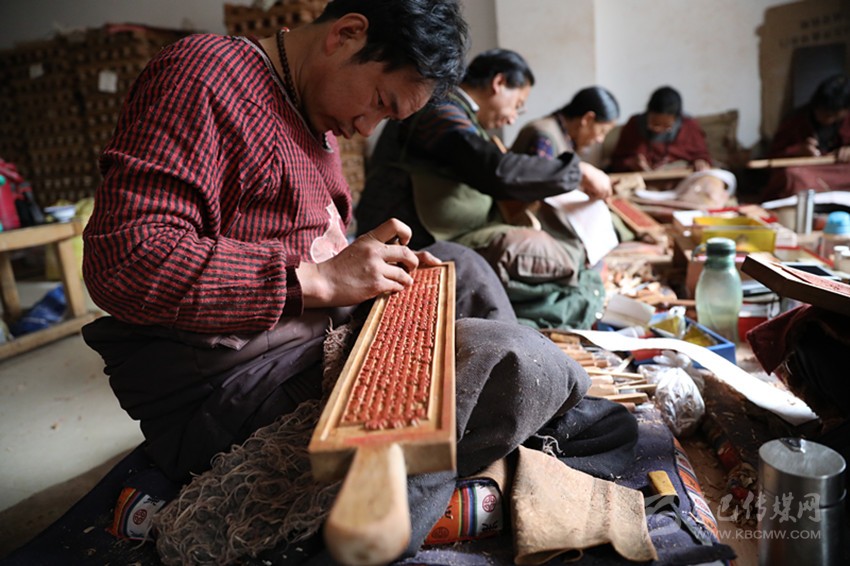 德格籍雕刻工匠格絨介紹說:“這是一項技術(shù)活,所有的文字都需要反刻在紅樺木上,我們大概六到七天能完成一塊經(jīng)板的雕刻。雕刻完成后還要經(jīng)過五次的校對,有錯的進(jìn)行再次校刻,最后在雕刻好的經(jīng)板上涂上酥油晾曬,一塊復(fù)刻經(jīng)板才算完成。”