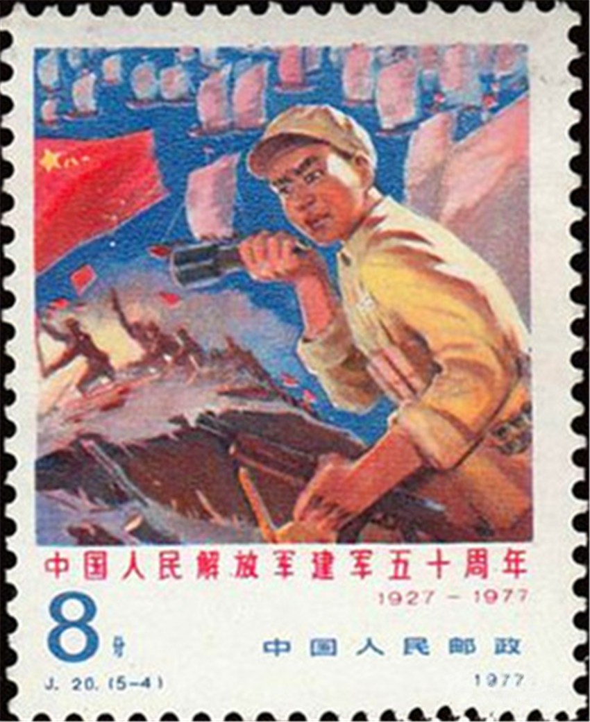 1977年8月1日原郵電部發行的《中國人民解放軍建軍50周年》紀念郵票,其中第4枚“雄師過大江”(圖3),圖案中一名沖在渡江隊伍前面的戰士高舉一面“八一”軍旗。