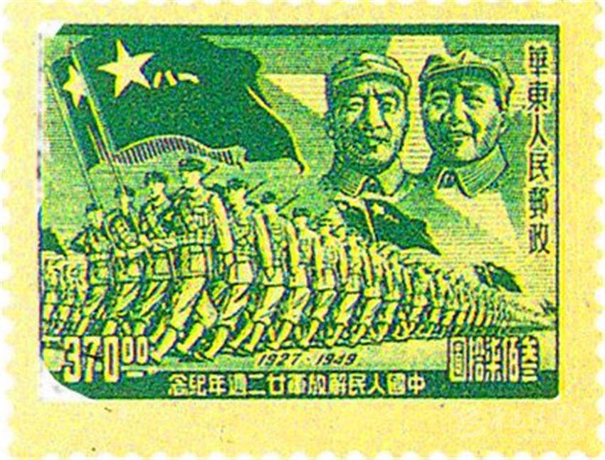 我國最早出現“八一軍旗”的郵票,是1949年8月1日, 剛解放的上海華東人民郵政發行的《中國人民解放軍建軍22周年》俗稱《華東進軍圖》郵票(圖1),一套5枚,同圖異色異值,郵票右上方為毛澤東主席和朱德總司令頭像,下方是鐵流般的人民軍隊高舉著一面面“八一軍旗”。 同年12月,西南區人民郵政又發行一套11枚圖案相同“西南進軍圖”郵票(圖2)。