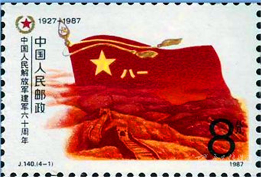 1987年8月1日原郵電部發行的《中國人民解放軍建軍60周年》紀念郵票一套4枚。其中第1枚“軍魂”(圖4),郵票上一面鮮紅的“八一”軍旗迎風飄揚,旗下是蜿蜒的萬里長城,代表了中國人民解放軍是保衛祖國和人民的“鋼鐵長城”。