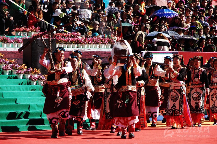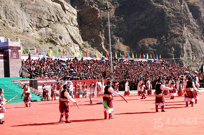 槍舞,嘉絨語中稱為“訥沖呷兒”,主要是在祭祀、集會、節日時表演的一種近似于戰術的舞蹈。在舞蹈中,舞者圍成一個圓圈,手持明火槍,明火槍,是最早的一種真正適于在戰場上為軍事目的使用的火槍。槍膛為一根圓柱形的鐵筒,筒口直徑為三厘米左右,在槍膛底部,有一個小圓孔伸出槍管,為導火管。如耳朵狀,因此也稱為槍耳,主要是用來點火的地方。圓筒固定在堅硬的木托頂端。這種輕火器或者說小型火炮使用的是形狀不規則的彈丸,即不大的實心彈,它緊貼大粒火藥制成的裝藥,借緊挨導火孔的火繩發射。