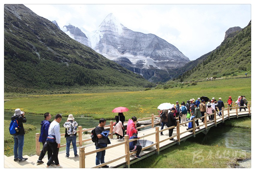 沒想到從景區(qū)的接駁車上一下來,第一眼看到的雪山就是仙乃日神山,而且,就在我們進入核心景區(qū)方向的右手邊上,一種近在咫尺的即視感!于是,人可是要有多激動就有多激動了。