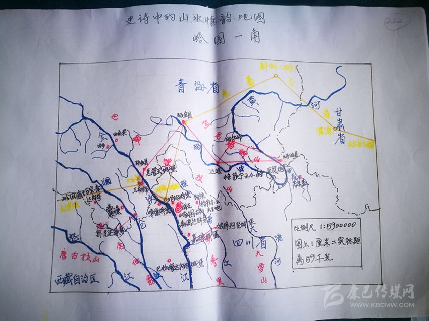 幾十個春秋里,劉安全所做的遠不止這些。他還自制了平面地圖、格薩爾王族譜圖等。根據實地考察所見,他繪制了43個“嶺”國城堡遺址地形簡圖,記者見到了其中幾幅。圖中,大山、河湖、遺址等清晰可見,不失為了解格薩爾史詩的上好資料。