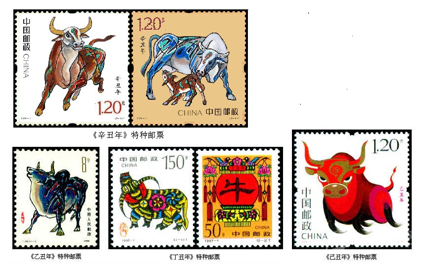 1997年1月5日發行第二輪生肖郵票中的“牛票”,即《丁丑年》特種郵票,全套2枚。由郵票設計師呼振源設計。第一枚“金牛奮蹄”,畫面依據山東省高密縣方市鄉前曹戈莊村當時33歲的農村女子齊秀花的剪紙作品《媳婦騎牛圖》進行設計,原作中的“媳婦”被刪去,突出了牛的形象,體現出膠東地區民間剪紙藝術源于生活、構思巧妙、粗獷中多見細膩的本色。只見那彎彎的牛角,垂地的長尾,壯實的牛身,穩健的四蹄,都真實地再現了生活中牛的特點,牛身上似花非花,似銅錢又非銅錢的紋飾,充分地表現出樸實的浪漫主義。第二枚“牛耕年豐”,畫面主圖為一只高高掛起的大紅燈籠上,映出了一個醒目的隸書“牛”字,為牛年的慶春象征。圍繞著這只燈籠,又進行了幾多創意,兩只喜鵲和一朵梅花,喻意“喜鵲登梅”;旒蘇上的兩朵牡丹,代表幸福、富貴;特別是那春意盎然的“雙牛圖”,畫面雖小,確為點睛之筆,與主圖的大“牛”字緊密呼應。
