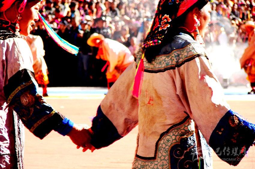 行不多時,一座美麗的村寨就出現(xiàn)在面前。眼前,一幢幢白色的藏房就散落在這如如世外桃源般的山坳里,它就是有著歌舞之鄉(xiāng)美譽(yù)的宅龍村寨。山寨中央,一條小徑將整個村寨一分為二,小徑以上的村寨為上宅龍,小徑以下的為下宅龍。因?yàn)檫@里曾是守備千總的衙門駐地,因此,與周邊使用嘉絨藏語的村寨比較,這里的人們習(xí)慣使用嘉絨藏語中的敬語交流,其語調(diào)柔和,語速較緩。這里的鍋莊舞獨(dú)樹一幟,服飾更是一絕。