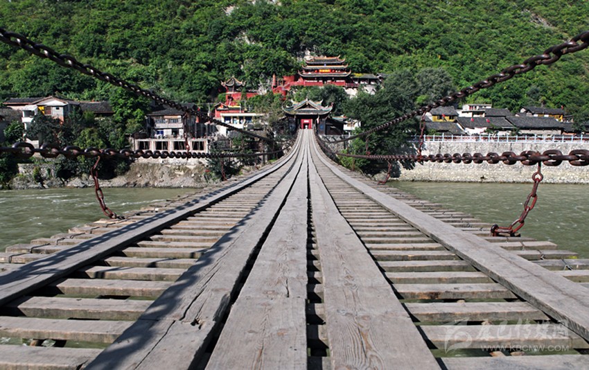 手握粗大烏黑的鐵鏈,感覺得到它的滄桑歷史與厚重沉淀,當年的工匠甩起膀子捶打鐵鏈時四處飛濺的火星,仿佛在眼前不停噴酒;扣住碩大亮堂的鐵環,簡直是在觸摸久遠歲月的流失與人非物是的變故;當年匠人舉著大手操起鐵鉗子將滾燙通紅的鐵環放入水中時發出“哧哧哧哧”的聲音似乎在耳旁久久回蕩;踩踏橋面上的板子,分明看見當年舍死忘死的勇士們在硝煙彈雨之中匍匐前進,犧牲紅軍戰士殷紅的鮮血染紅了大渡河的浪花;凝視滾滾翻騰的波濤,依稀可見當年民眾將鐵鏈糸在竹筒上兩頭對拉的場景,眾人在兩岸使力時發出“嗨約嗨約”的吆喝聲地動山搖震撼人心……