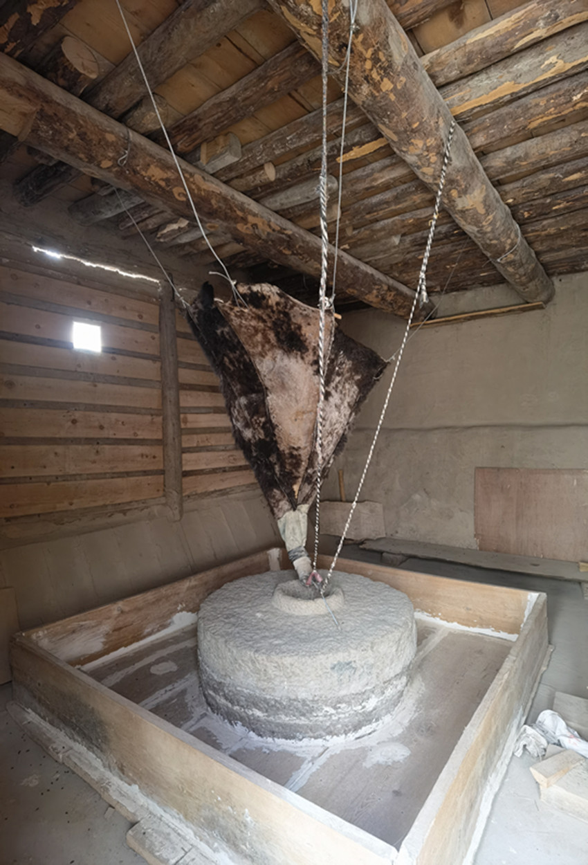 一條約三米寬的水渠橫穿眼前,水渠在側面依次開了七個口子。上游三個用來排水,冬天用隔板擋著,夏天則用來泄水。中游三個口子都是磨坊的動力來源。走進去是一處水磨坊,三座半徑約0.8米的石磨間隔1.7米一字排開。頂端是牛皮制成的青稞喂料器,由四根繩子系在房間頂角的不同方向;尾端是由牛角制作的喂料嘴,略顯復雜的繩拉式調節器錯綜復雜,但卻精妙無比地控制著青稞的出料速度。