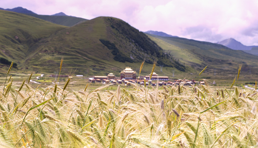 甘孜縣地處橫斷山脈的東北邊緣,康北地區腹心地帶,雅礱江從這里緩緩流過,肥沃的土壤和無垠的土地總會配上澄徹晴朗的天空。一顆顆飽滿金黃的青稞常在風里搖晃著秋天,“康北糧倉”的美在這時展現得淋漓盡致。