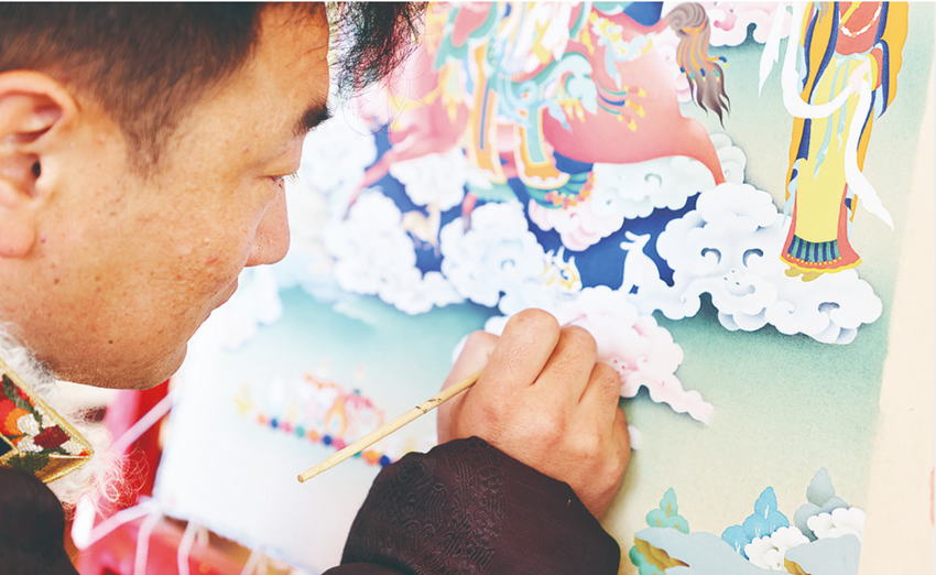 一幅好的唐卡,不僅體現了畫師的精湛技藝,同時也體現了畫師對傳統文化的深刻理解,每幅作品不僅傾注了畫師的大量心血,同時也傾注了畫師的豐沛情感。白玉縣的門薩唐卡作為藏文化藝術的一種繪畫形式,有其獨特的傳統工藝和鮮明的民族特色。在其傳承和發展的過程中,又吸收和借鑒了周邊地區的藝術形式,形成兼容并蓄而又獨樹一幟的繪畫風格,具有很高的藝術價值。
