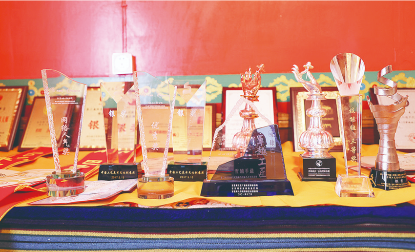 走進河坡藏族金屬手工制作技藝傳習所,只見書桌上擺放著各類獎杯和證書,大大小小的唐卡畫布布滿房間各個角落。其麥告訴筆者,“我從小就在父親的教育下學習唐卡繪畫,現在不負父親的期望,已能獨當一面,很榮幸能獲得這些獎項。”