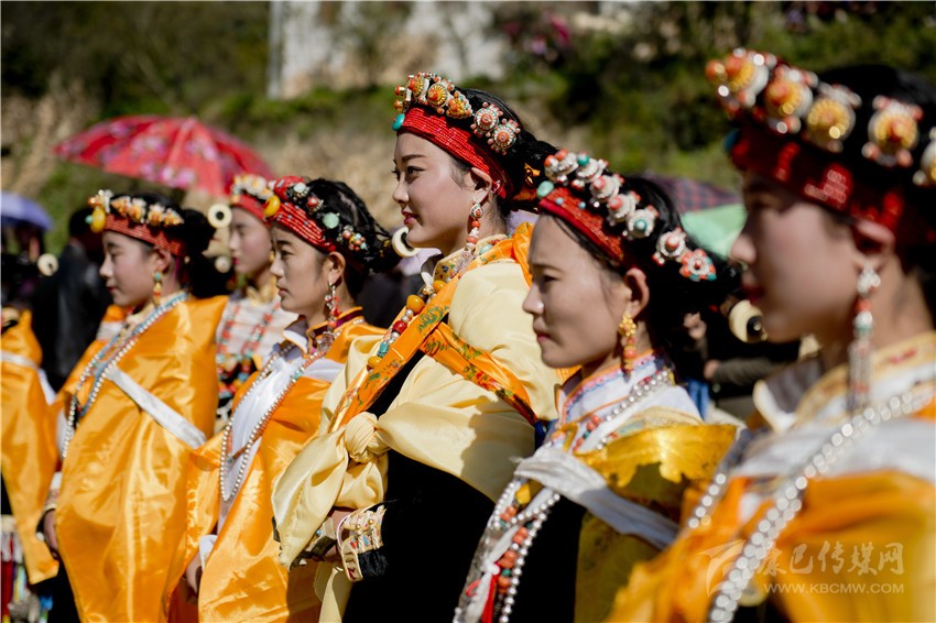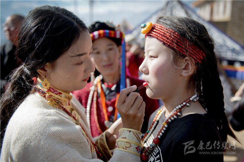 盤好發髻,佩戴好頭飾,在肩、背系好五彩哈達后,由本村具有威望的女性長者引領來到儀式現場。法號聲中,煨桑的青煙裊裊升起,威嚴的活佛主持誦經祈福儀式。隨后,德高望重的長者為參加儀式的女子送祝福茶,長輩為姑娘們獻哈達。一系列儀式結束后,無論男女老少,都來到場地中央,踏歌起舞,跳起吉祥的鍋莊。