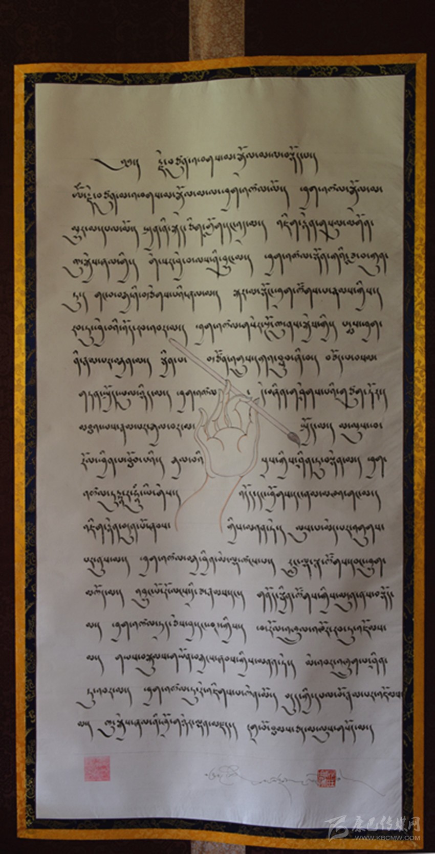 談到藏文書法作品,昂旺曲批喜歡用諸如“淳樸、干凈、善良”的字眼形容藏文書法作品的風格。“一個字就是一個人,字有肉也有骨頭。”這是昂旺曲批對“德珍派”書法的理解,在昂旺曲批眼中,藏文字都是有生命的,需要寧心靜氣方能通過手中的筆尖,彼此呼應。