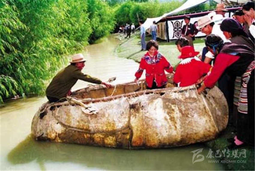 牛皮船,顧名思義是牛皮做的船,做牛皮船的材料很簡單,只用木料和牛皮。木頭要選用韌性較好的樹木做骨架,把泡軟、牛毛基本褪凈的4張牦牛皮縫起來,并將濕牛皮包在木骨架上繃好,用牛皮繩子捆緊、曬干、擦油定型,再把牛皮縫口接頭處擦抹大量牛、羊油以便將接縫密封,避免進水,再配上一對劃槳,就可以下水使用了,一只牛皮船只需一個船夫。