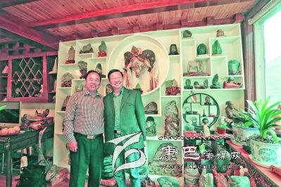 扎西澤仁(左)與州攝協主席郭昌平在奇石博物架前合影。