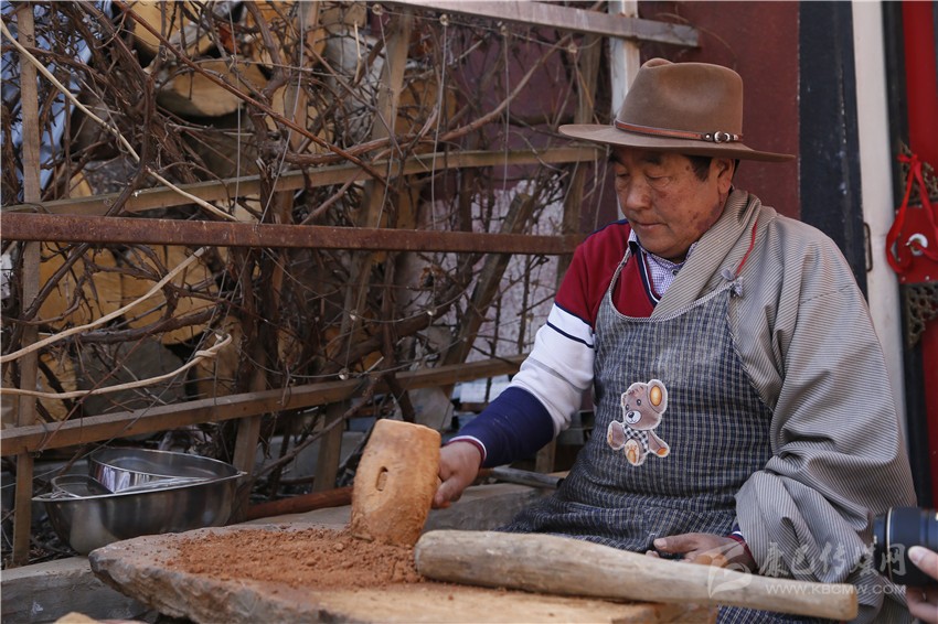 清晨,大師背起背簍和鋤頭來到海拔4000米以上的山上挖泥,挖泥前要舉行簡單的祭祀儀式,用脫水的松柏枝和酥油糌粑混合燃燒。裊裊清香彌漫在山間,這時大師用鋤頭挖著制作藥泥面具的泥土,泥土分為紅色雌泥和白色雄泥,雌雄兩種泥土結合后具有一定的硬度,以此制作的面具不會出現裂開的情況,同時保證配方藥不變質。
