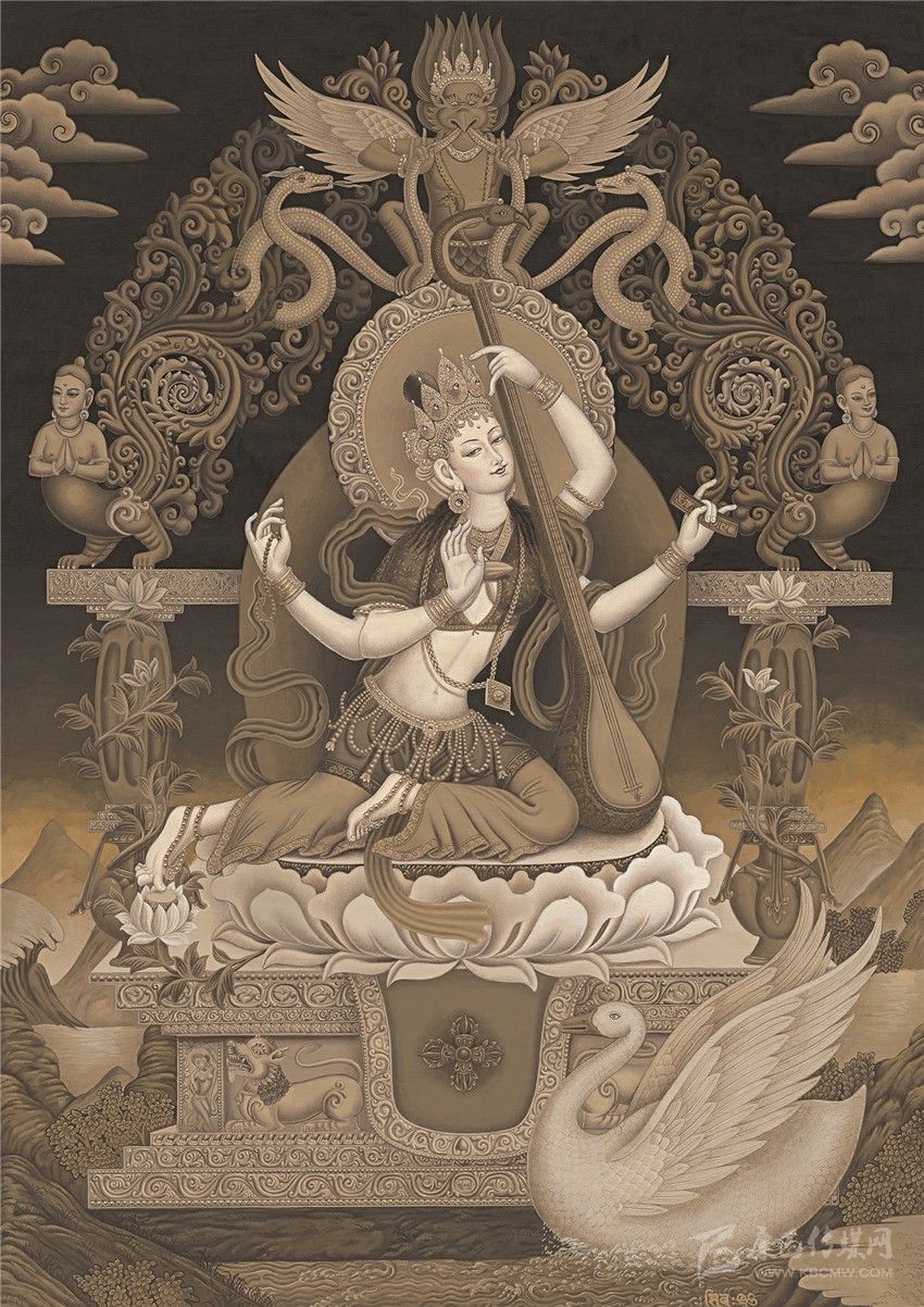 (一)對比色調:畫面顏色干凈,對比強烈,大多用對比色來彰顯力量;施金華麗、燦爛而不泛濫。(二)暗色調:畫面明度較低,常用黑色、藏青、絳紅、深綠來調劑各類原色,使得畫面色彩沉郁中透露出清新、凝重中綻放出優雅,色彩的過渡細膩而豐富。(三)素色調:尼瓦爾唐卡最有特色的就是“素色調”的唐卡(簡稱“素唐”)。筆者之所以稱其為“素色調”而不稱作“黑白”或“單色”,是因為畫面雖然沒有明顯的色彩,但是也非單一的黑色或灰色。它不僅調配了從深到淺的許多色階;還有雅致的黃灰、曠遠的藍灰、宏大的紅灰等諸般色相的交響以及微妙的冷暖搭配,整體呈現出夢幻般的美感。