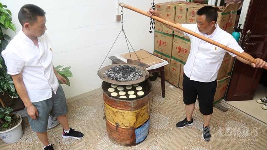 用酥皮包裹好餡料,放入模具內壓緊壓實。點心脫模后在點上屬于“周聾子點心”的獨家標記(四瓣花),便可進入烤制流程,烤爐分為上鏊與下鏊。首先將吊爐上下火都提前預熱至250°左右,然后把制作好的點心正面朝下放在吊爐里,最后將上鏊移入吊爐上方,進行點心的烤制。根據經驗確定烤制時間,當吊爐里飄出香味后,即可將上鏊挪離吊爐。點心背面呈現出“偷油婆色”(焦黃色)后,迅速將點心翻面,繼續烤制成褐色,出爐即可食用。