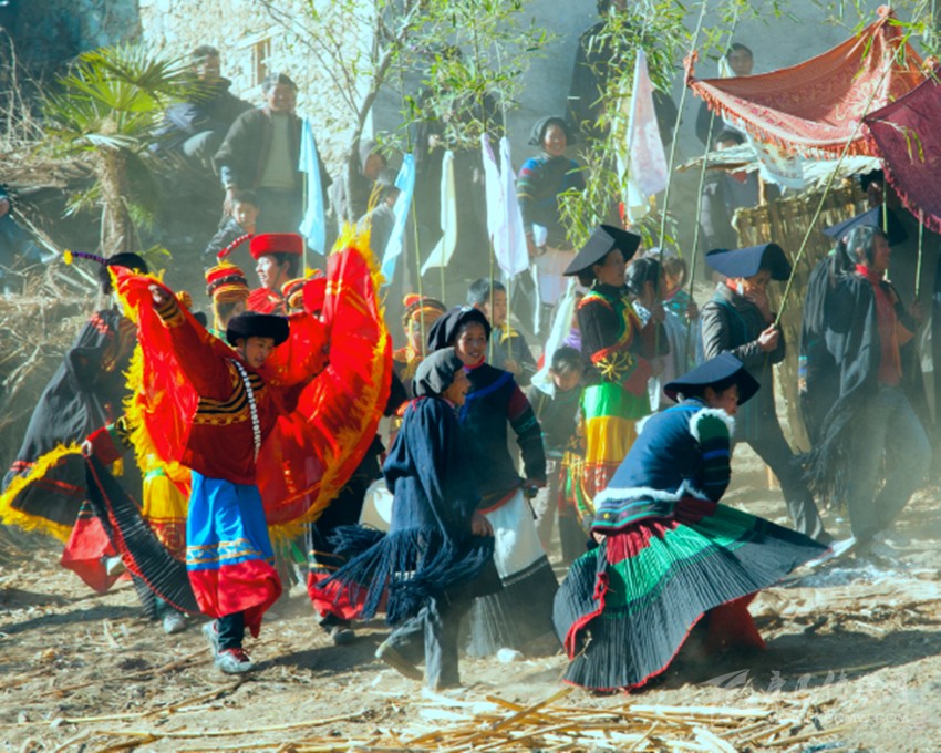 我帶著阿爸給我準備的迎親酒向李木坪走去。我激動、欣慰,然而也深感惶恐不安。激動欣慰的是我就要看到我日夜思念的新娘了,惶恐不安的是我怕被新娘的“近衛軍”們捉住,罰酒背新娘。護送新娘到男方家完婚的全都是清一色的男性,有新娘的長輩、哥哥、弟弟、表兄弟等等。按彝家的風俗,新郎如果在戒備森嚴中摸到新娘,就讓“近衛軍”們乖乖地把新娘背到新郎家里;如果摸不到,不僅新郎被罰酒,而且新郎還得老老實實把新娘背到家里。罰酒、背新娘倒不在乎,就怕站在遠處看熱鬧的小伙和姑娘們奚落一通,說摸不到新娘是沒本事的新郎。