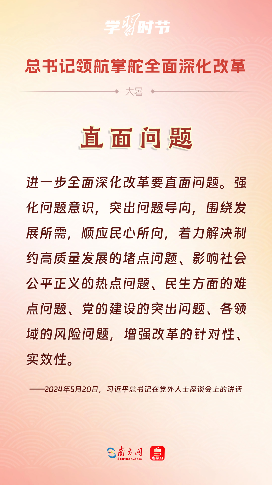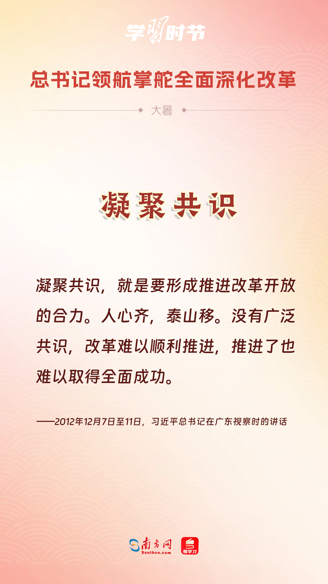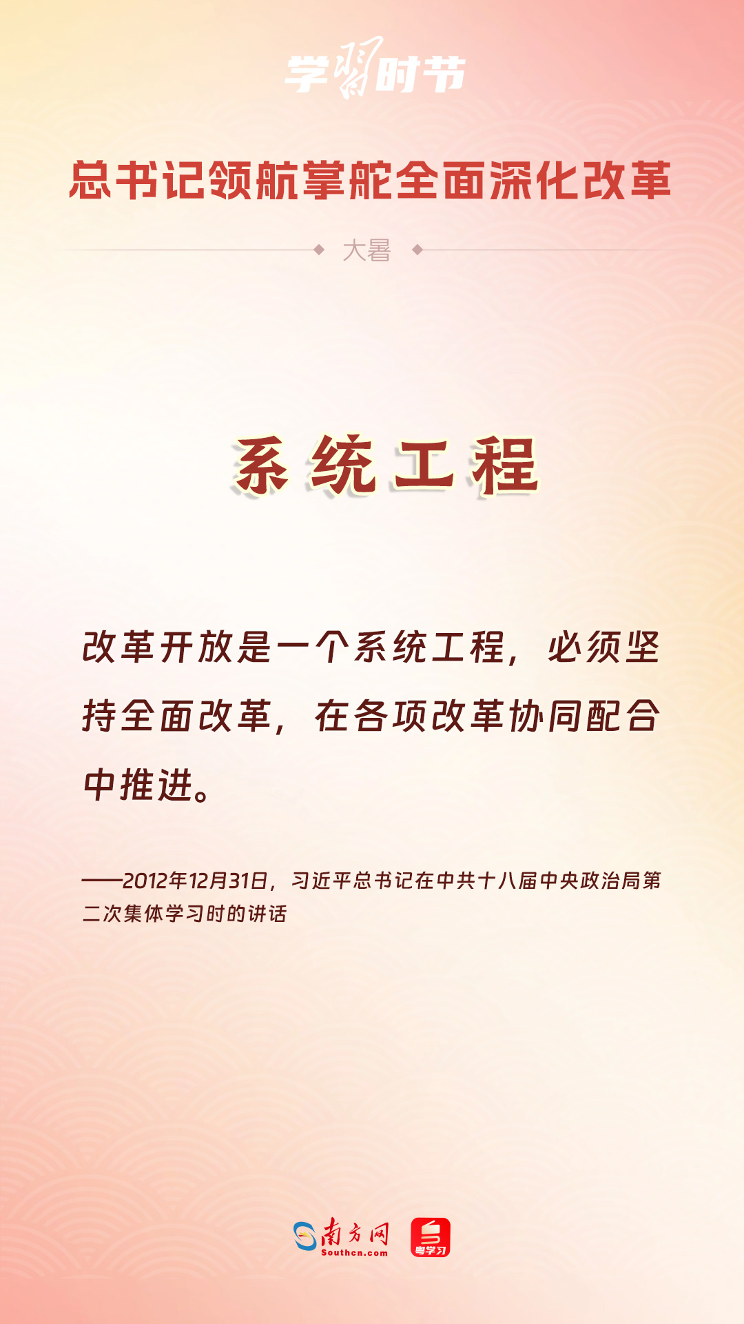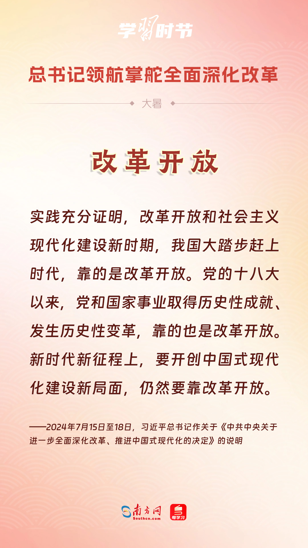 黨的十八大以來(lái),習(xí)近平總書(shū)記親自領(lǐng)導(dǎo)、親自部署、親自推動(dòng)全面深化改革工作,推動(dòng)全面深化改革事業(yè)在攻堅(jiān)克難中不斷邁上新臺(tái)階、取得新勝利。在驕陽(yáng)似火的大暑時(shí)節(jié),通過(guò)一組海報(bào),讓我們共同學(xué)習(xí)習(xí)近平總書(shū)記關(guān)于“全面深化改革”的重要論述。