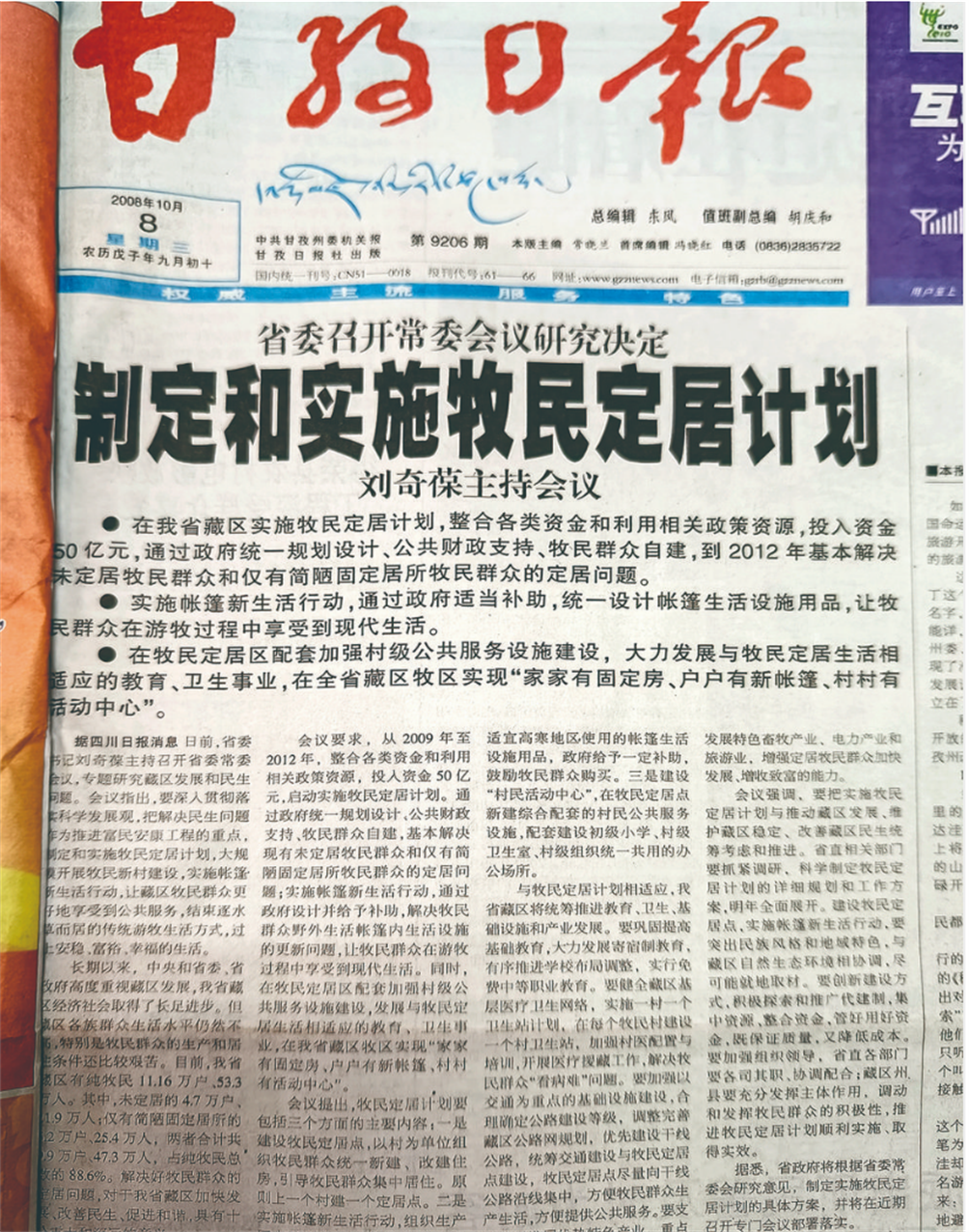 翻開2008年10月8日《甘孜日報》第一版,頭條新聞《制定和實施牧民定居計劃》中載明,省委、省政府作出決定,把解決民生問題作為推進富民安康工程的重點,在全省涉藏地區牧區推行“牧民定居計劃”,力求在2012年結束全省涉藏地區牧民的游牧無定居生活。2009年1月,甘孜州的摸底數據表明,“牧民定居行動計劃”的落地實施,會讓當地5.7萬戶、26萬牧民直接獲益。