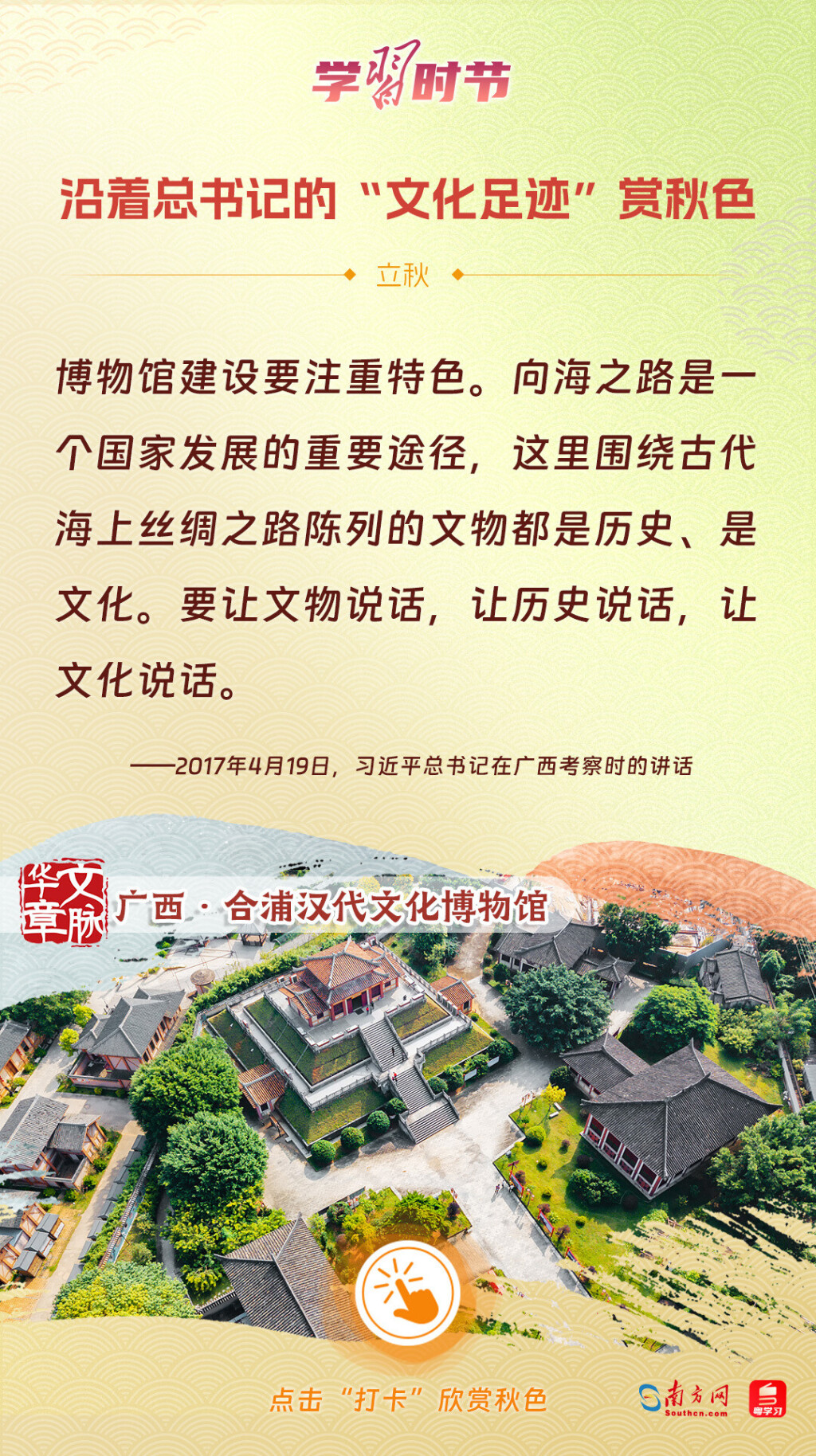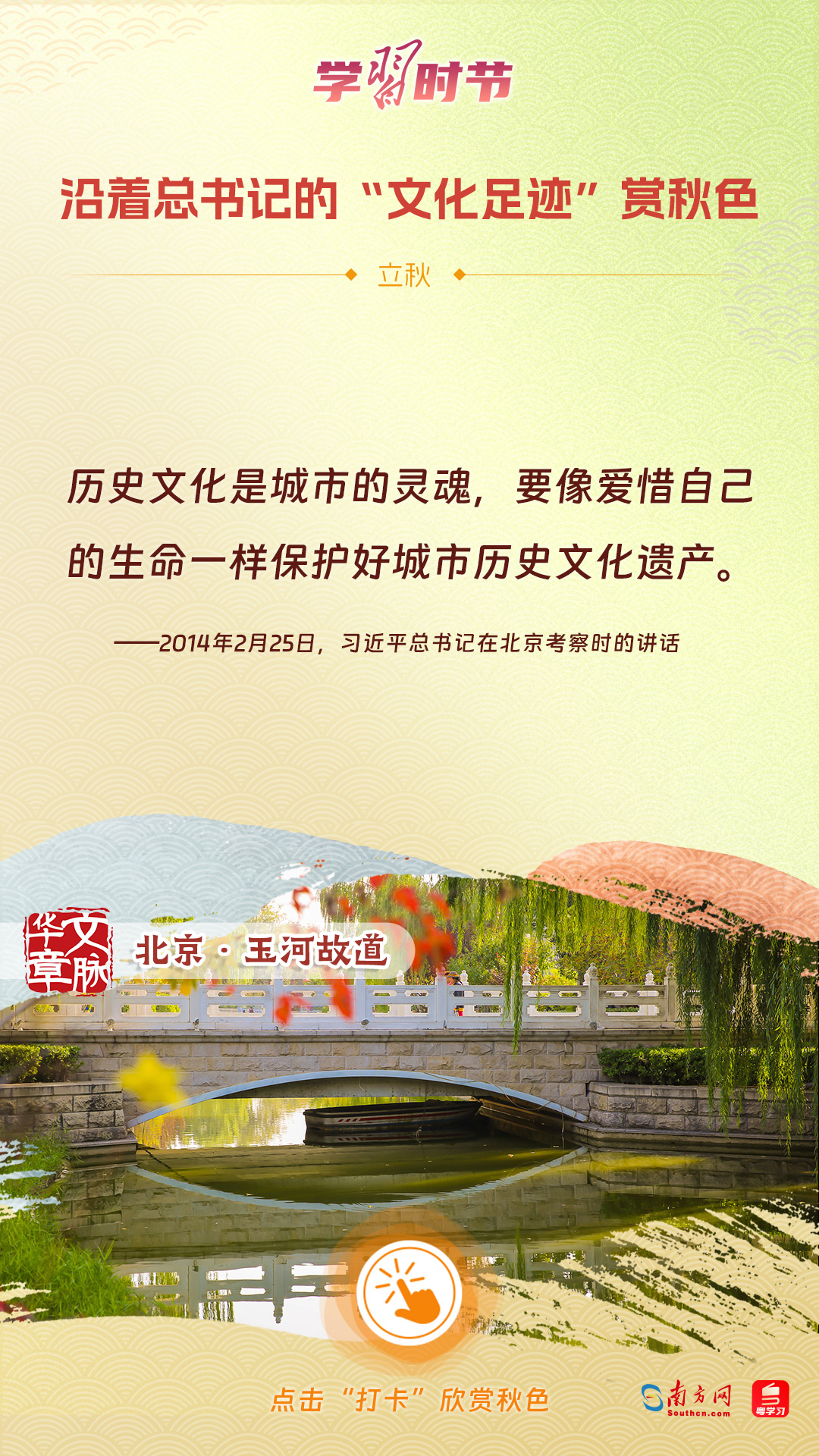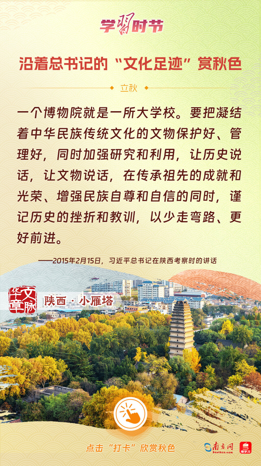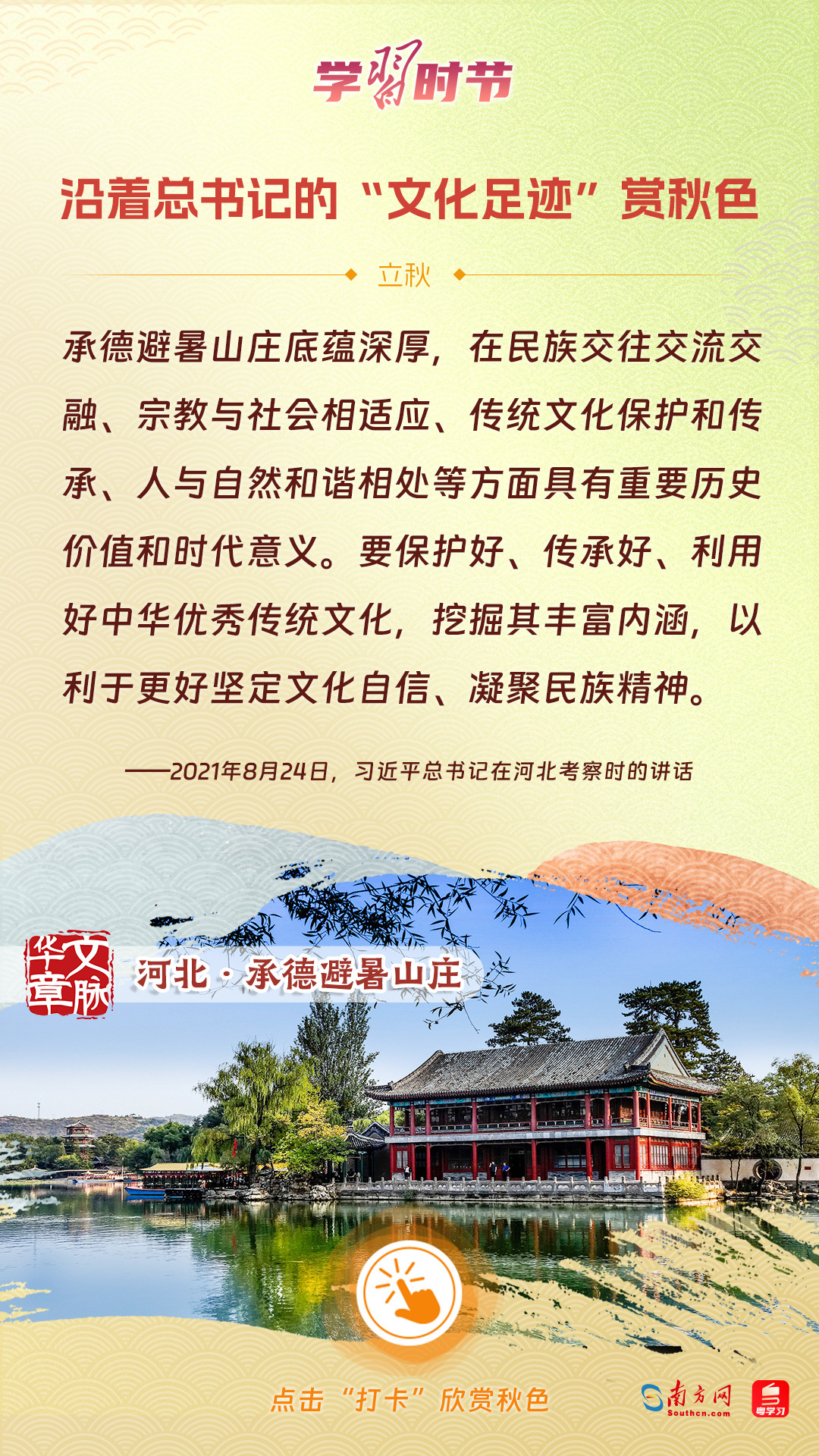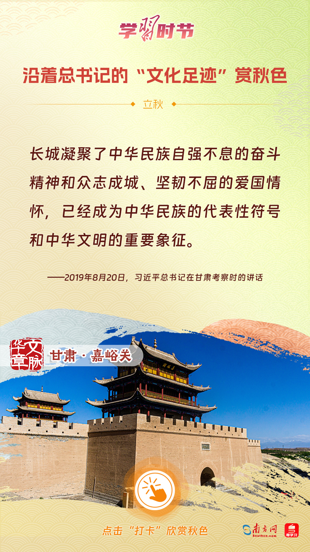 立秋之際,讓我們一起跟隨習近平總書記的足跡,學習習近平總書記關于文化建設的重要論述,感受全國各地文化地標古跡的秋意,汲取文化自信的強大力量。
