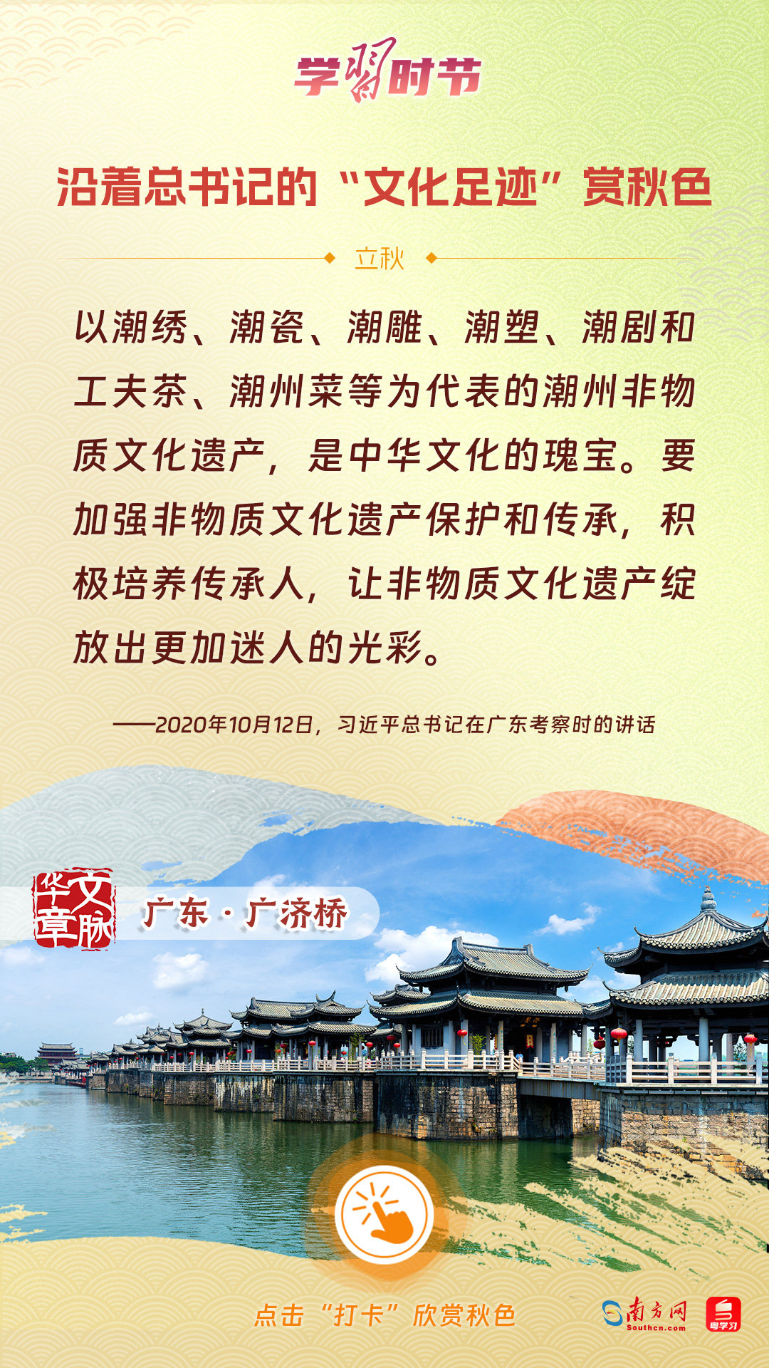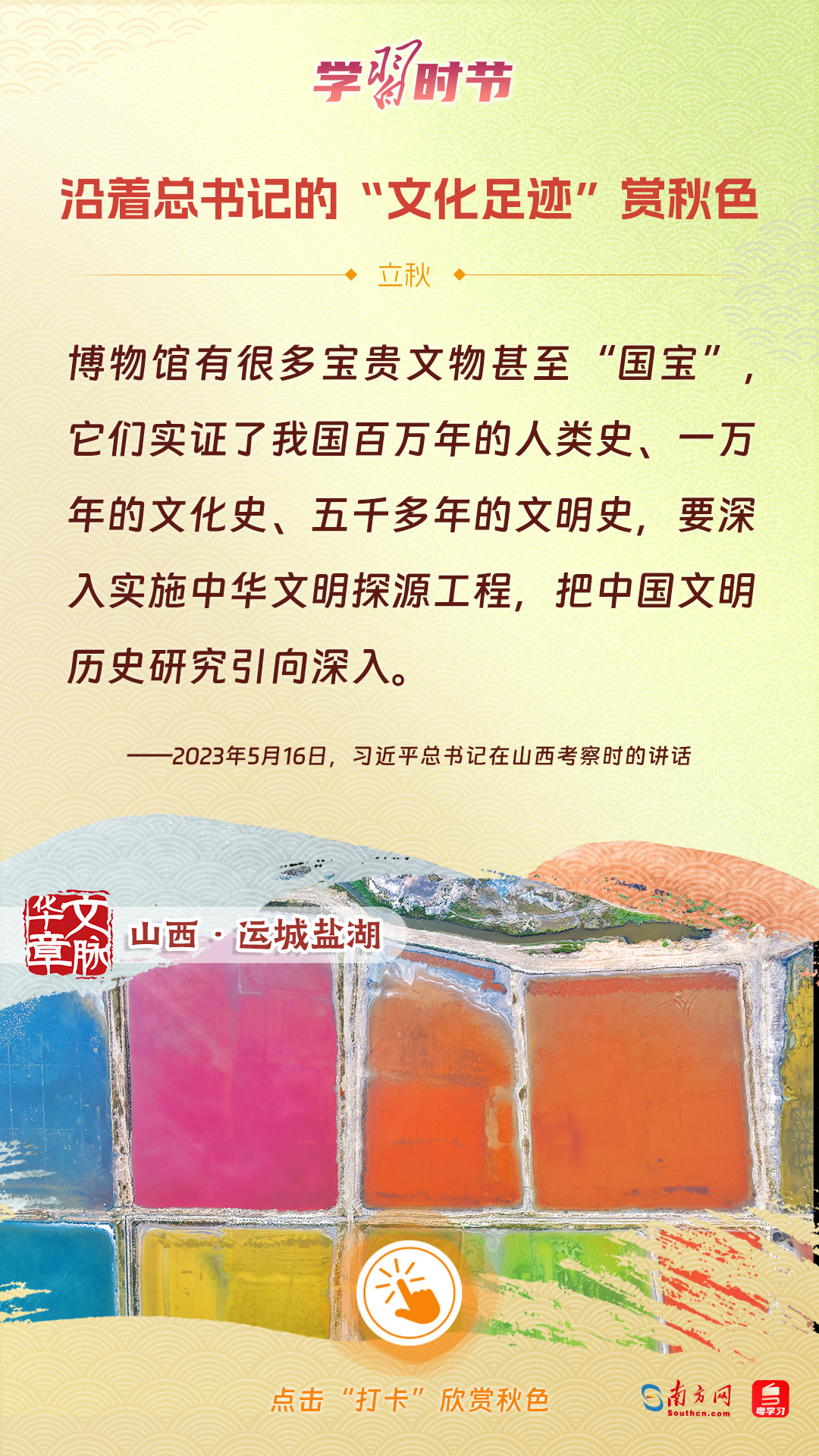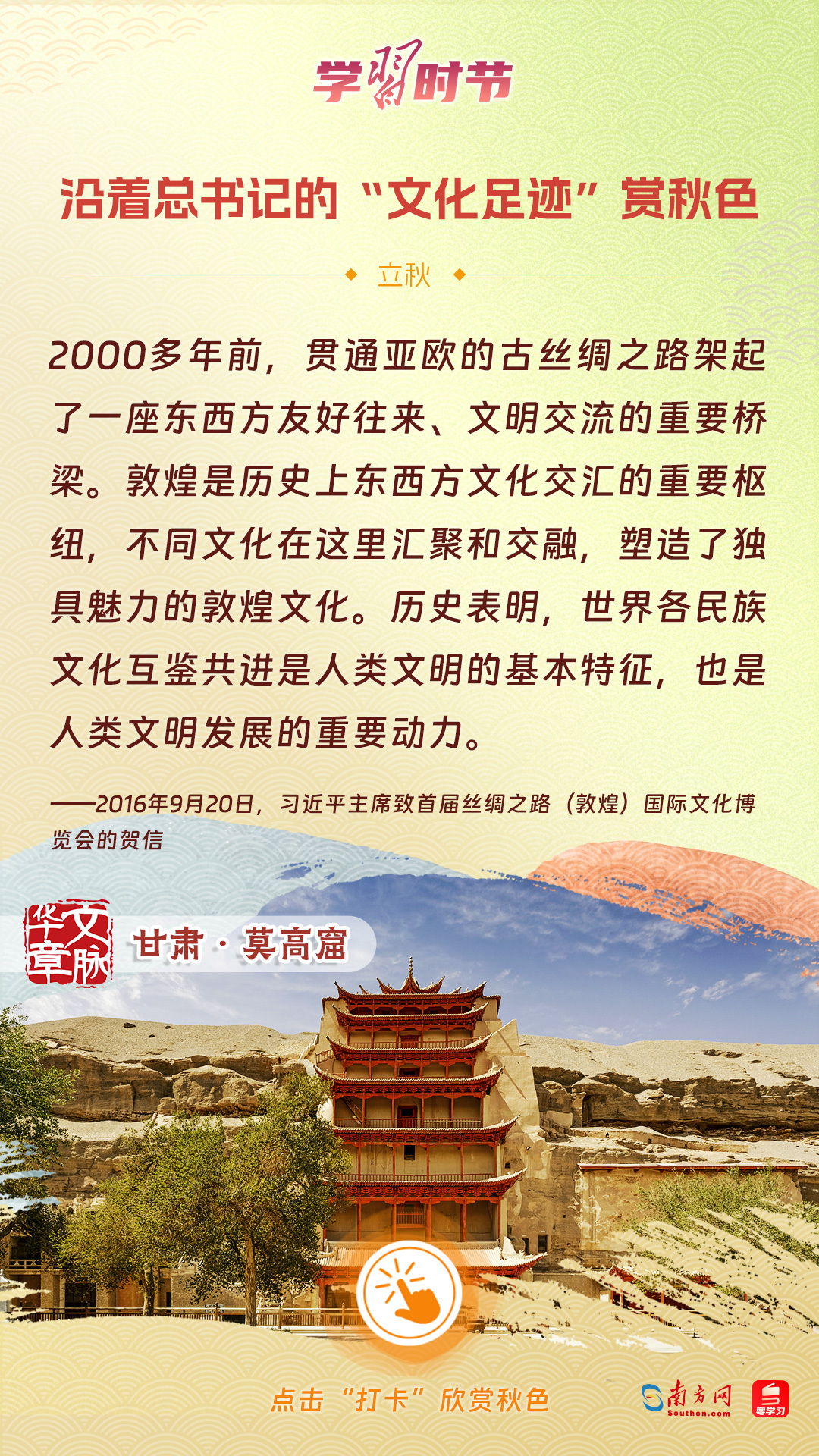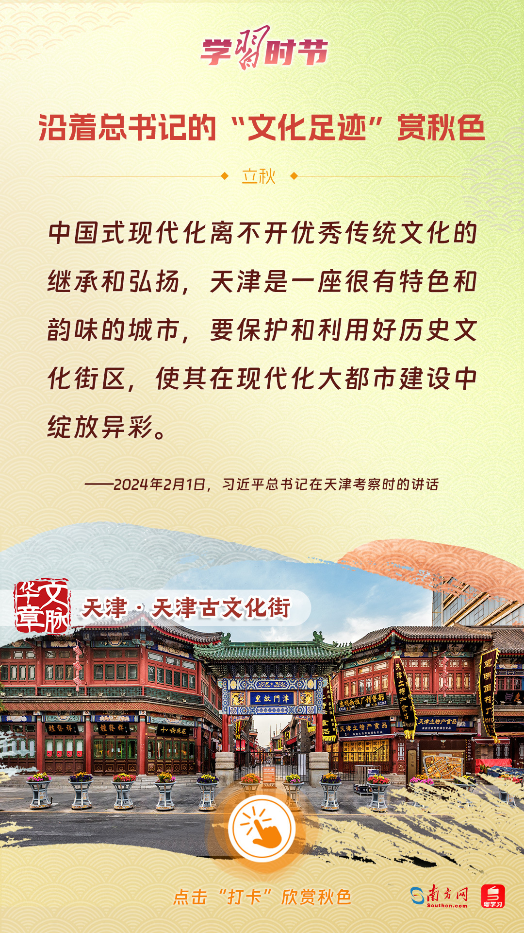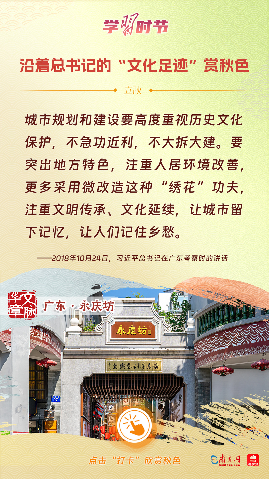 立秋之際,讓我們一起跟隨習近平總書記的足跡,學習習近平總書記關于文化建設的重要論述,感受全國各地文化地標古跡的秋意,汲取文化自信的強大力量。