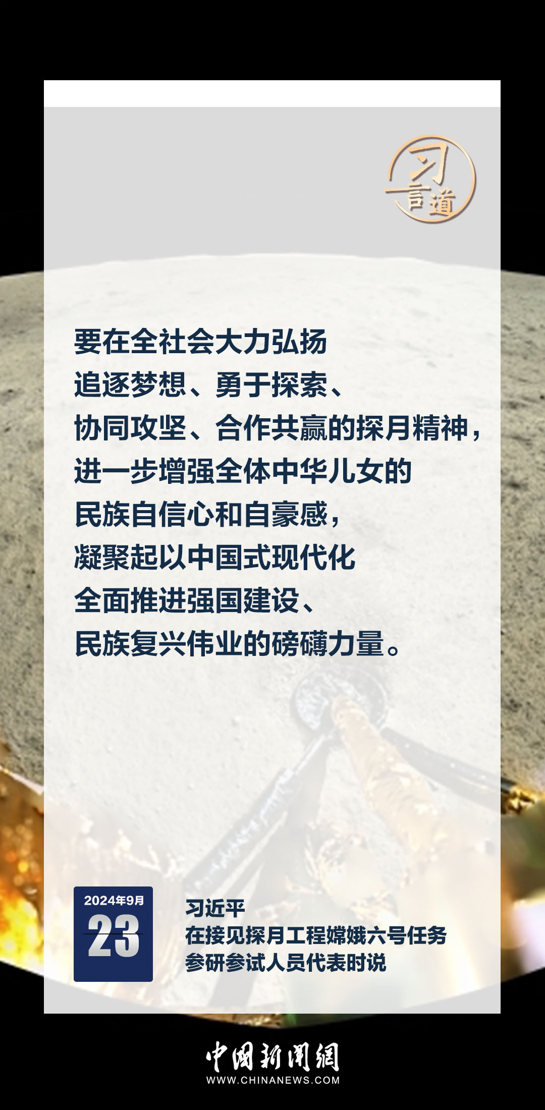 中共中央總書記、國家主席、中央軍委主席習近平23日在人民大會堂接見探月工程嫦娥六號任務參研參試人員代表時發表重要講話。習近平指出——