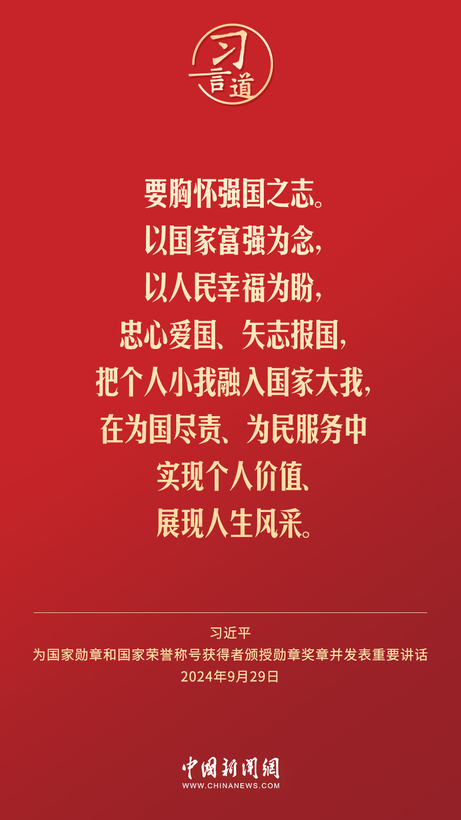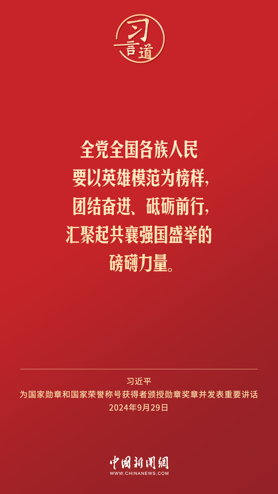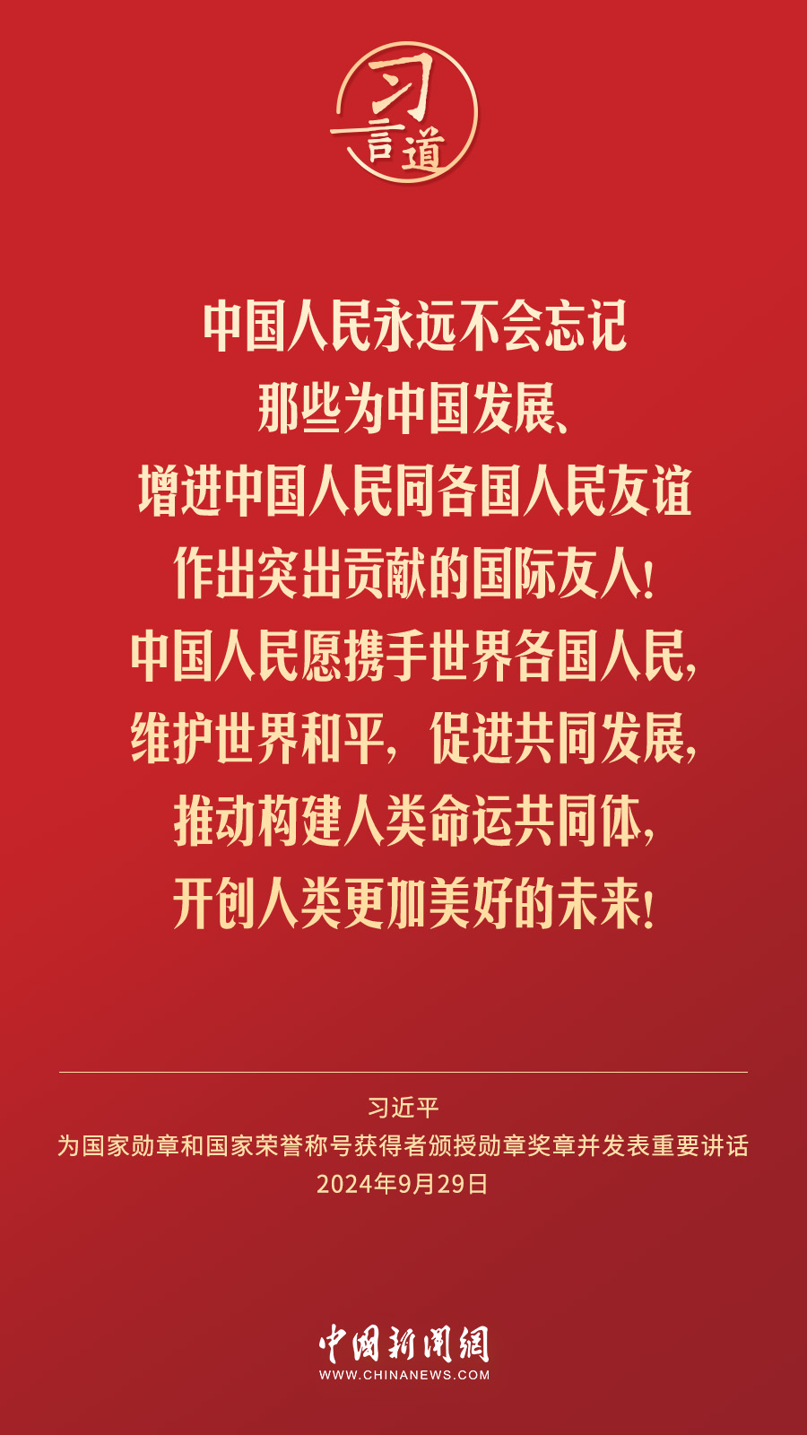 經中共中央批準,中華人民共和國國家勛章和國家榮譽稱號頒授儀式于9月29日上午10時在人民大會堂隆重舉行。中共中央總書記、國家主席、中央軍委主席習近平向國家勛章和國家榮譽稱號獲得者分別授予“共和國勛章”“友誼勛章”和國家榮譽稱號獎章并發表重要講話。習近平指出——