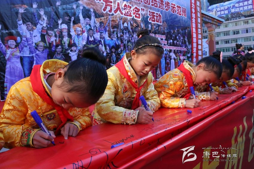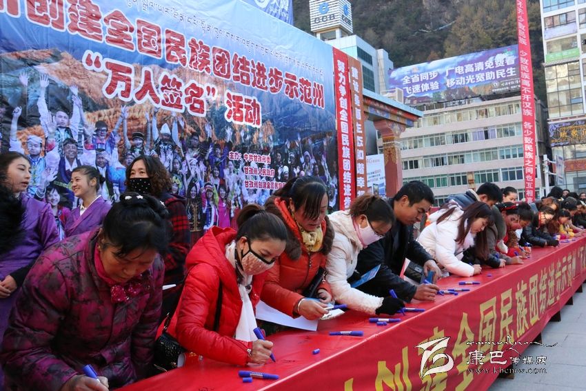 州人大常委會副主任李致民宣布創(chuàng)建全國民族團結(jié)進步示范州“萬人簽名”活動正式開始后,州領(lǐng)導(dǎo)汪洋、李致民、楊國元、范文華、蔣秀英、楊學(xué)康以及甘孜軍分區(qū)、駐州武警部隊領(lǐng)導(dǎo)同州級機關(guān)、志愿者、個體工商戶、學(xué)生、駐軍、政法干警、康定縣黨政機關(guān)干部代表近千人,陸續(xù)到“萬人簽名”條幅上簽下了自己的姓名。