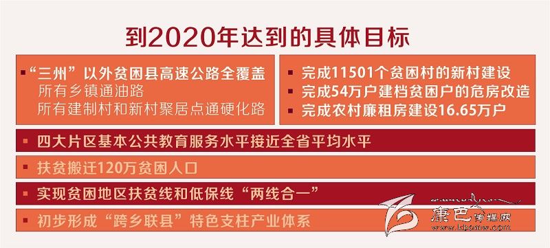 方案提出,到2020年“三州”以外貧困縣高速公路全覆蓋,所有鄉鎮通油路、所有建制村和新村聚居點通硬化路;完成11501個貧困村的新村建設,全面完成54萬戶建檔貧困戶的危房改造,完成農村廉租房建設16.65萬戶;四大片區基本公共教育服務水平接近全省平均水平;扶貧搬遷120萬貧困人口;實現貧困地區扶貧線和低保線“兩線合一”;初步形成“跨鄉聯縣”特色支柱產業體系等多項具體目標。最終,確保省委提出的497.65萬農村貧困人口全部脫貧、11501個貧困村和88個貧困縣全部“摘帽”,貧困縣農民人均純收入比2010年翻一番以上,實現基本公共服務均等化、社會保障全覆蓋的目標全面實現。