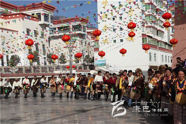 大年初三早上十點,鄉城縣城的社區群眾穿戴盛裝在香巴拉休閑廣場圍成大圓圈,跳起了歡快的鍋莊。隨著歌師的唱詞,男女舞者手牽著手踏著節拍邊唱邊跳,讓節日的鄉城縣城充滿了喜慶的氣氛。