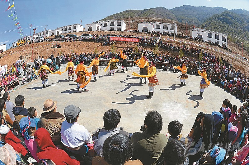 得榮縣將白松鄉同歸村納入生態移民搬遷工程,修建了14戶藏式新居。2016年3月,同歸村藏族群眾聚集在一起慶祝搬遷新居。 記者 李向雨 攝(資料圖片)